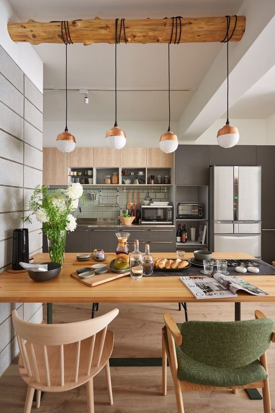 A madeira, assim como outros elementos da natureza, é responsável por “aquecer” o ambiente, e este recurso deve ser adicionado na decoração em diversos pontos, como uma mesa bem bonita, um balcão, na parede ou com objetos decorativos.