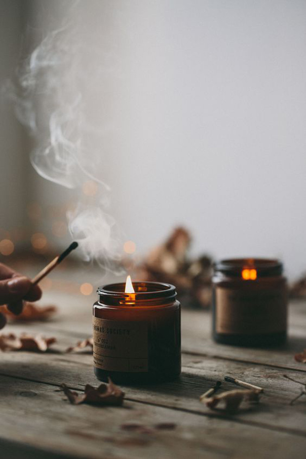Velas também são excelentes recursos para adicionar uma iluminação mais aconchegante ao ambiente, e a versão perfumada é um bônus para estimular os sentidos.