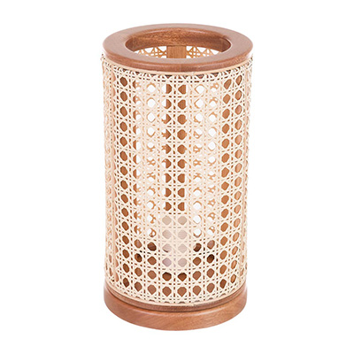 Material: Luminária de mesa, com base em madeira Jequitibá natural e cúpula em palhinha de tom natural
