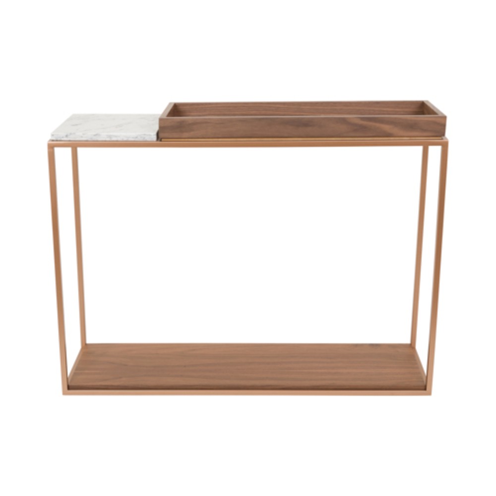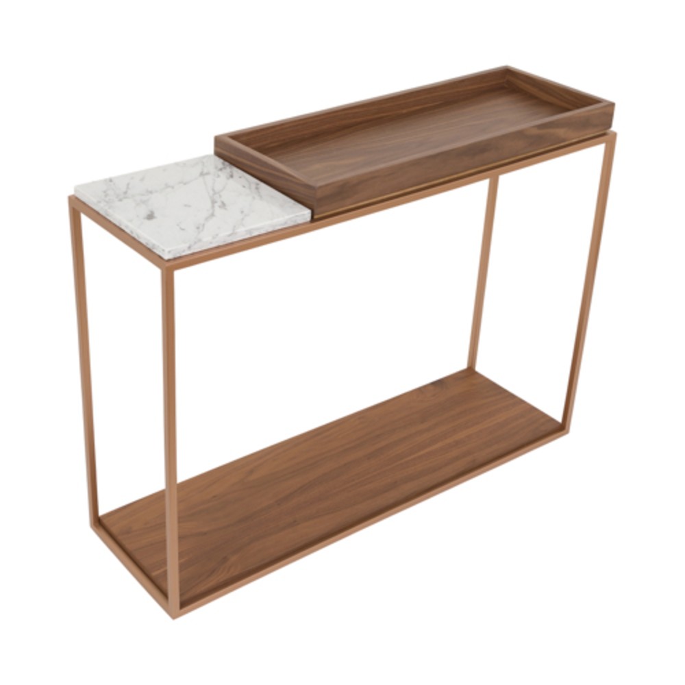 Material: Tampo inferior e superior em laminado, com detalhe em Mármore Carrara e estrutura em aço inox tonalizado