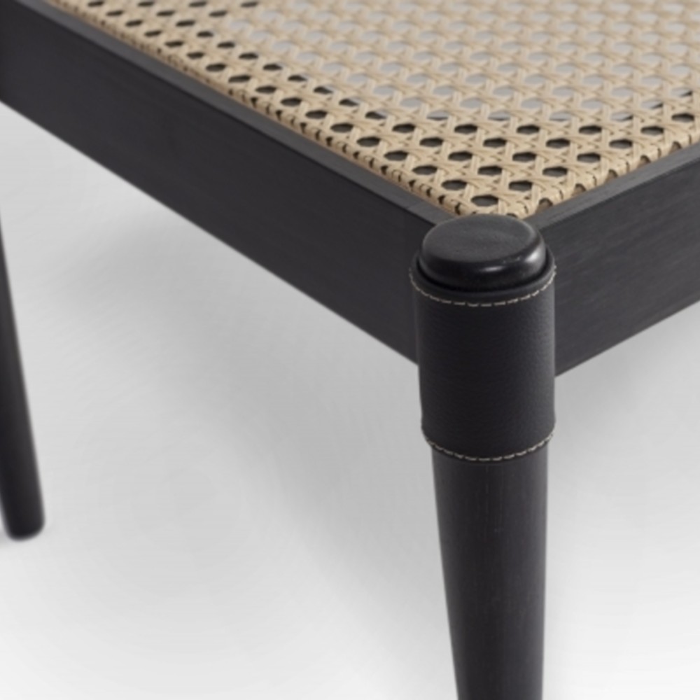 Material: Estrutura de madeira ebanizada preta, detalhe em couro natural, palha Portuguesa com tec A-726 preto