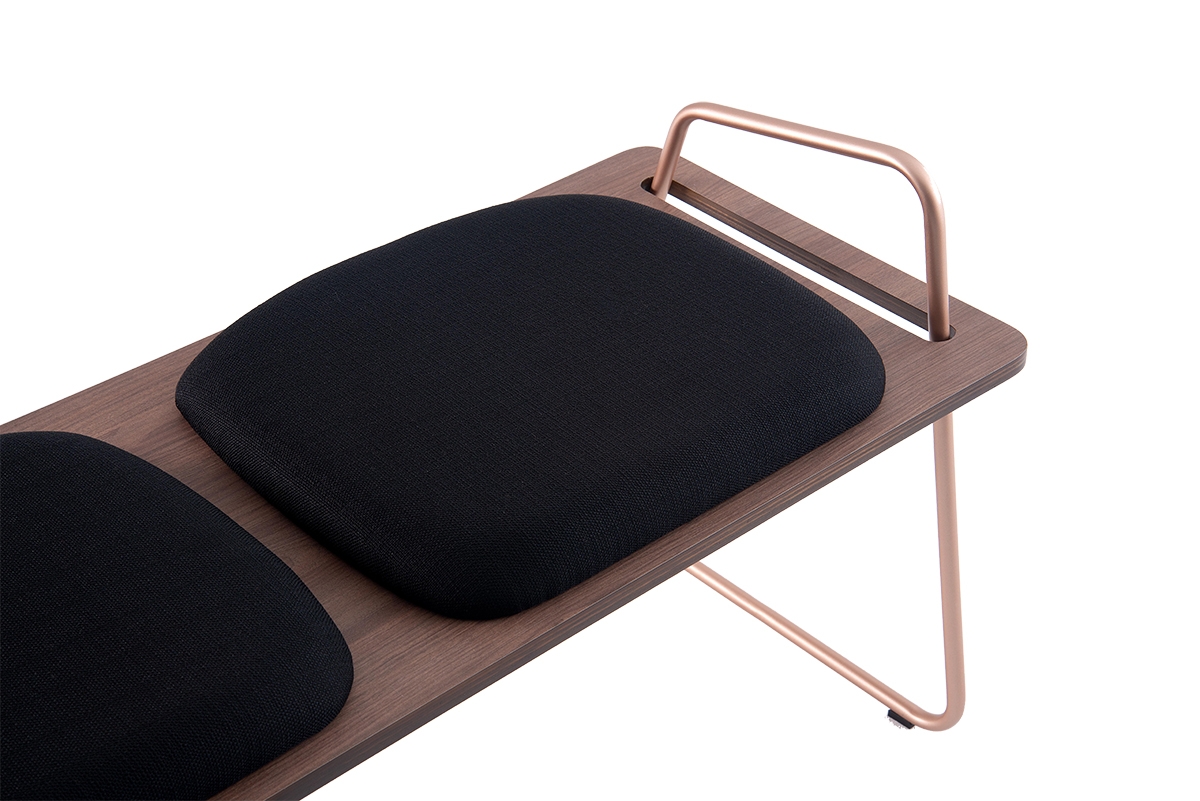 Com inspiração no estilo urbano, o banco Urban busca criar ambientes originais sem perder a elegância. Combina o metal pintado, com o banco amadeirado e os assentos estofados. O destaque fica por conta do pé de metal que atravessa o vazado do banco, criando uma troca de planos e servindo como apoio.