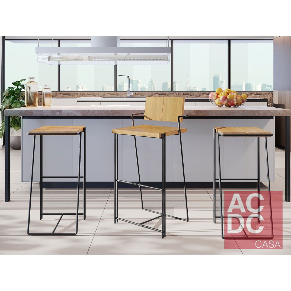 Material: Banco com estrutura em metal, pés em aço carbono e tampo em madeira maciça Tauari.