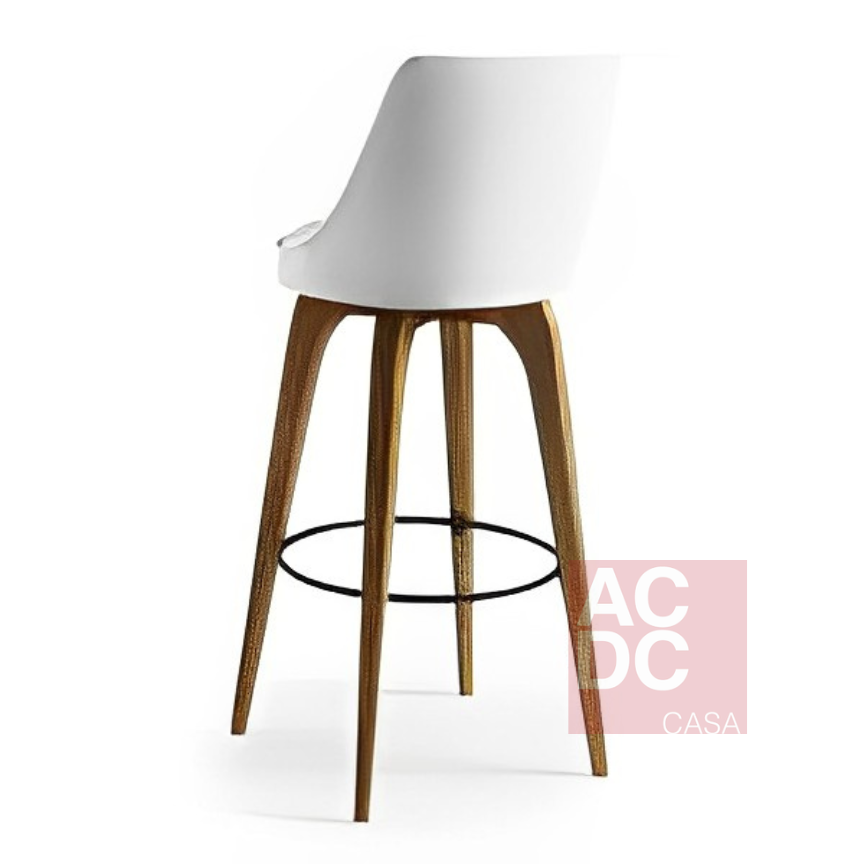 Material: Base em madeira maciça tingida, estofada e giratória – Apoio de pé em aço carbono, apenas em preto epóxi