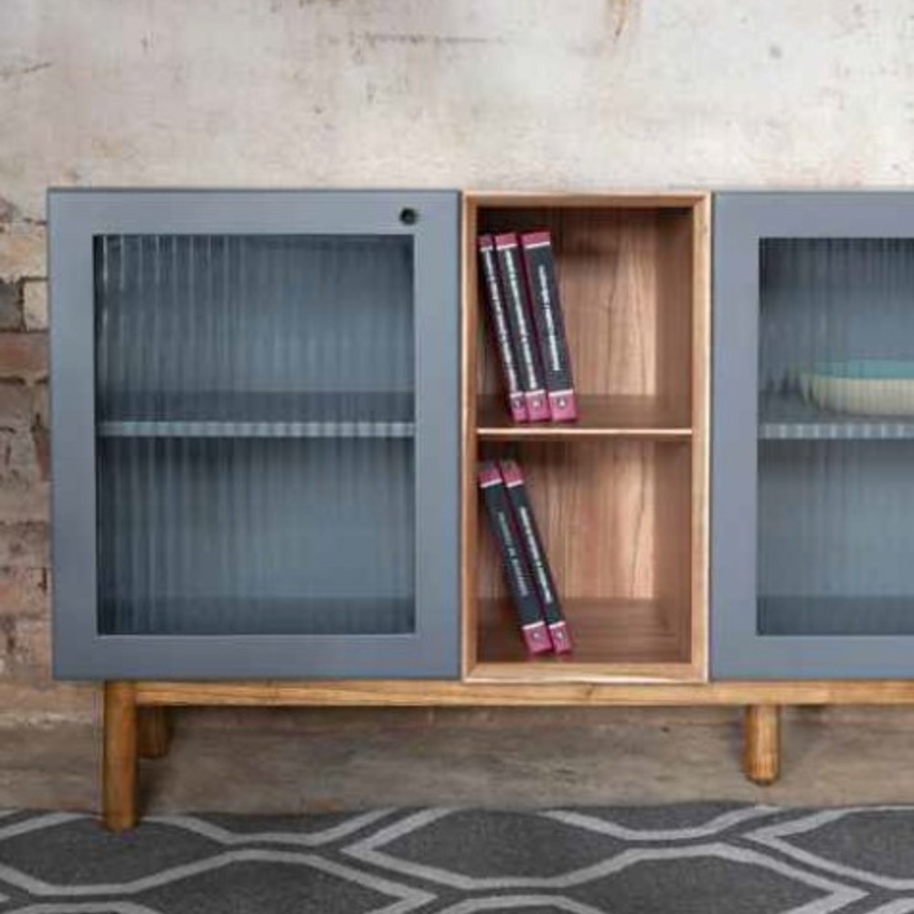 Material: Base de madeira, nicho laminado, corpo laqueado e vidro canelado.