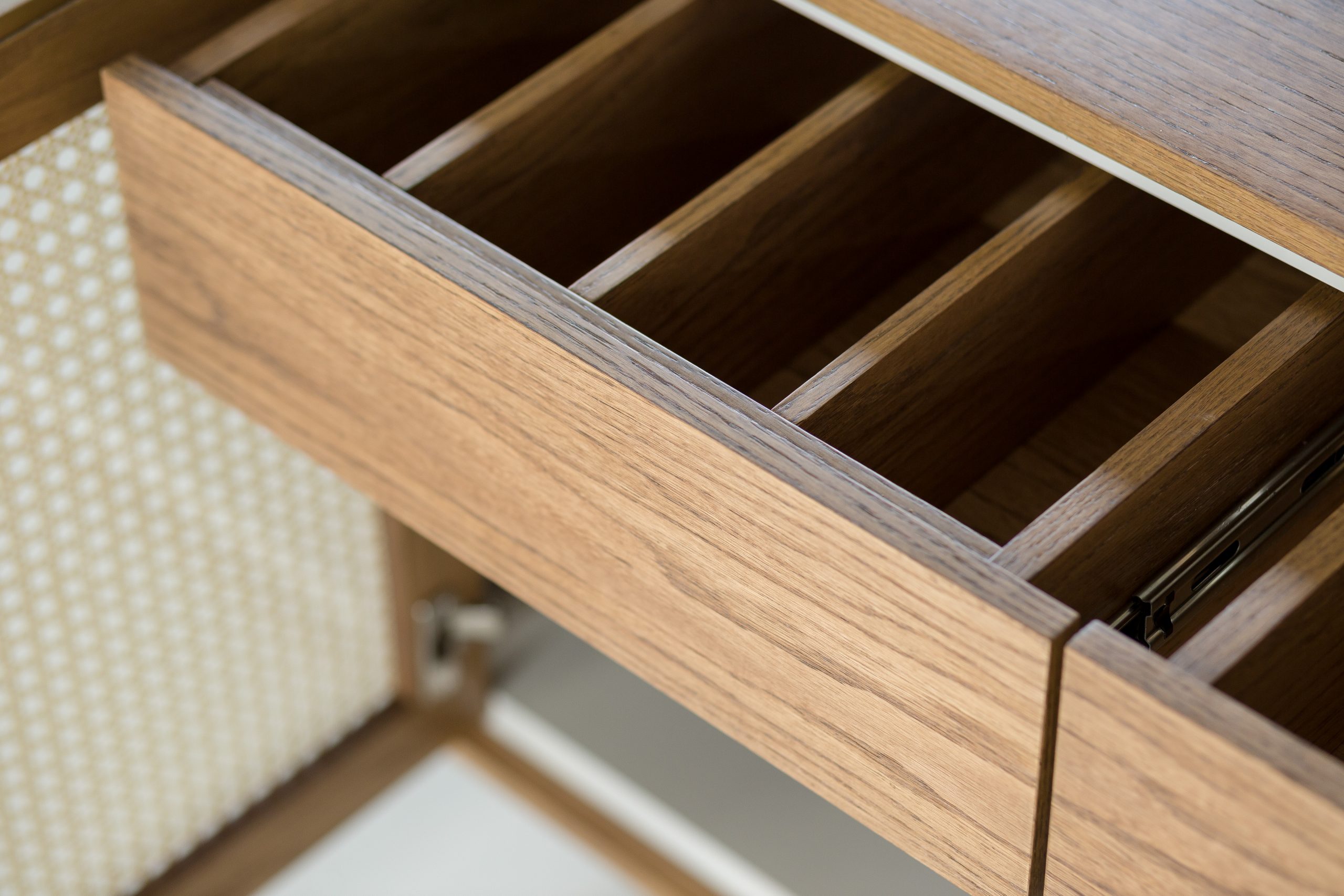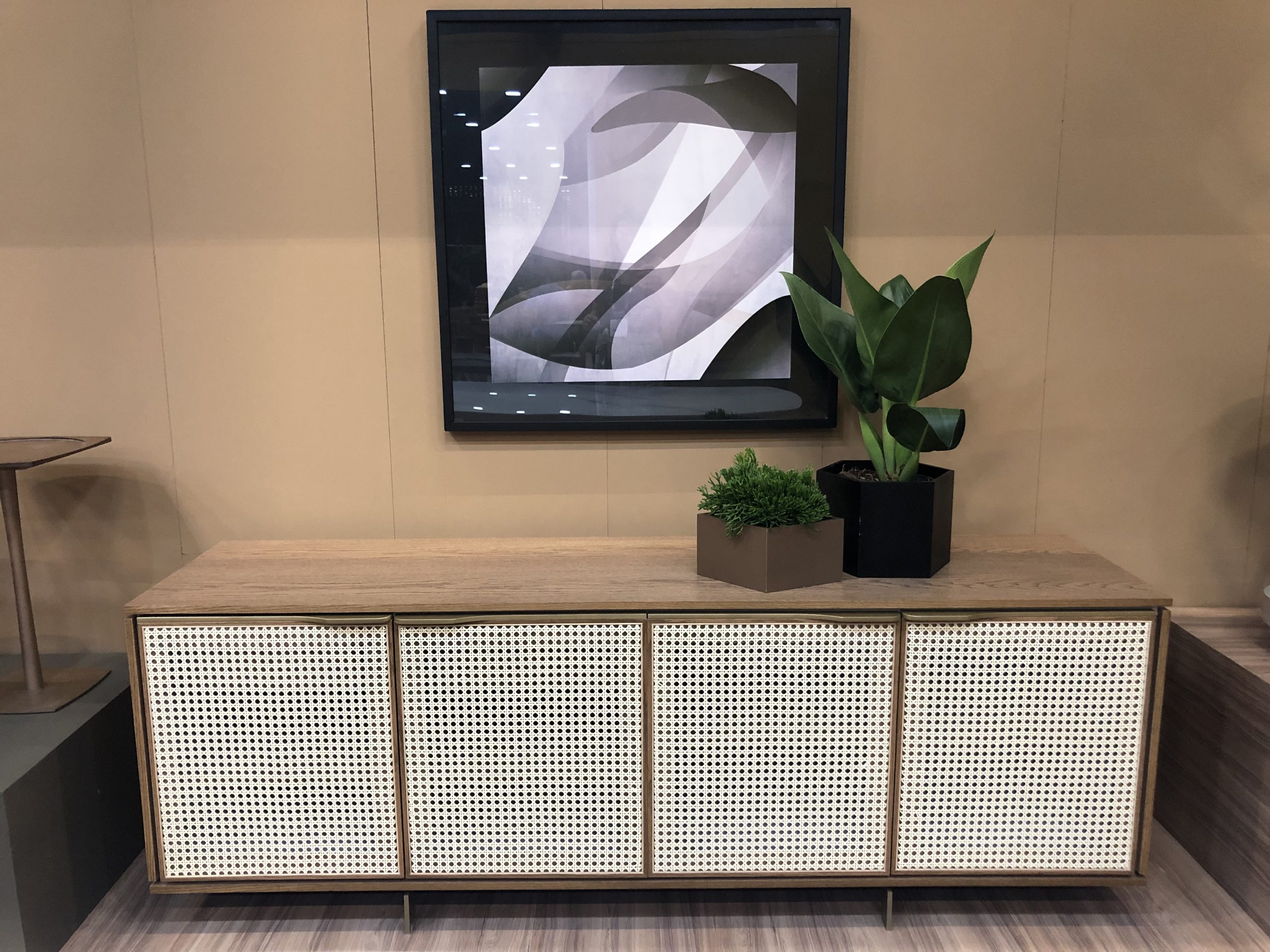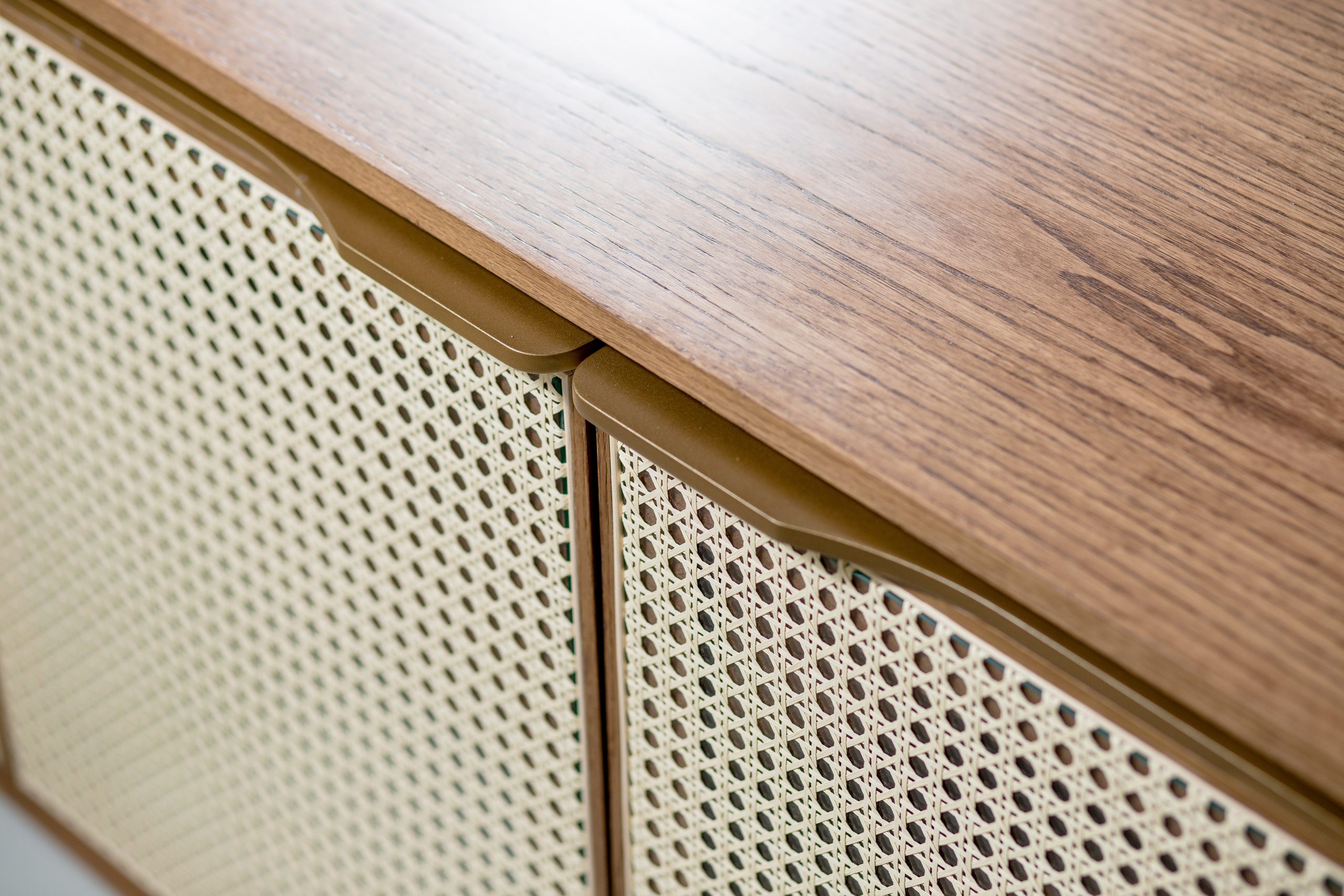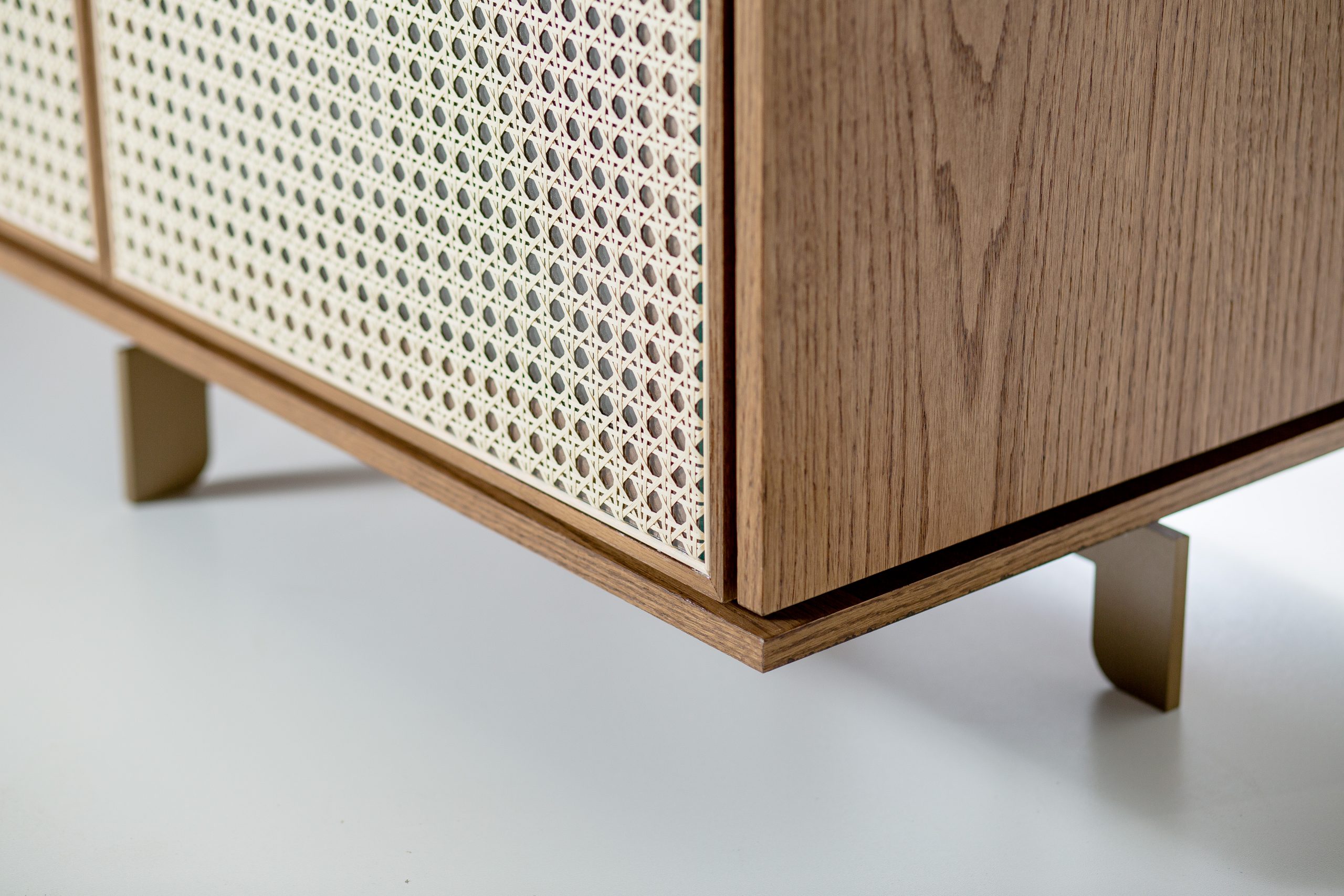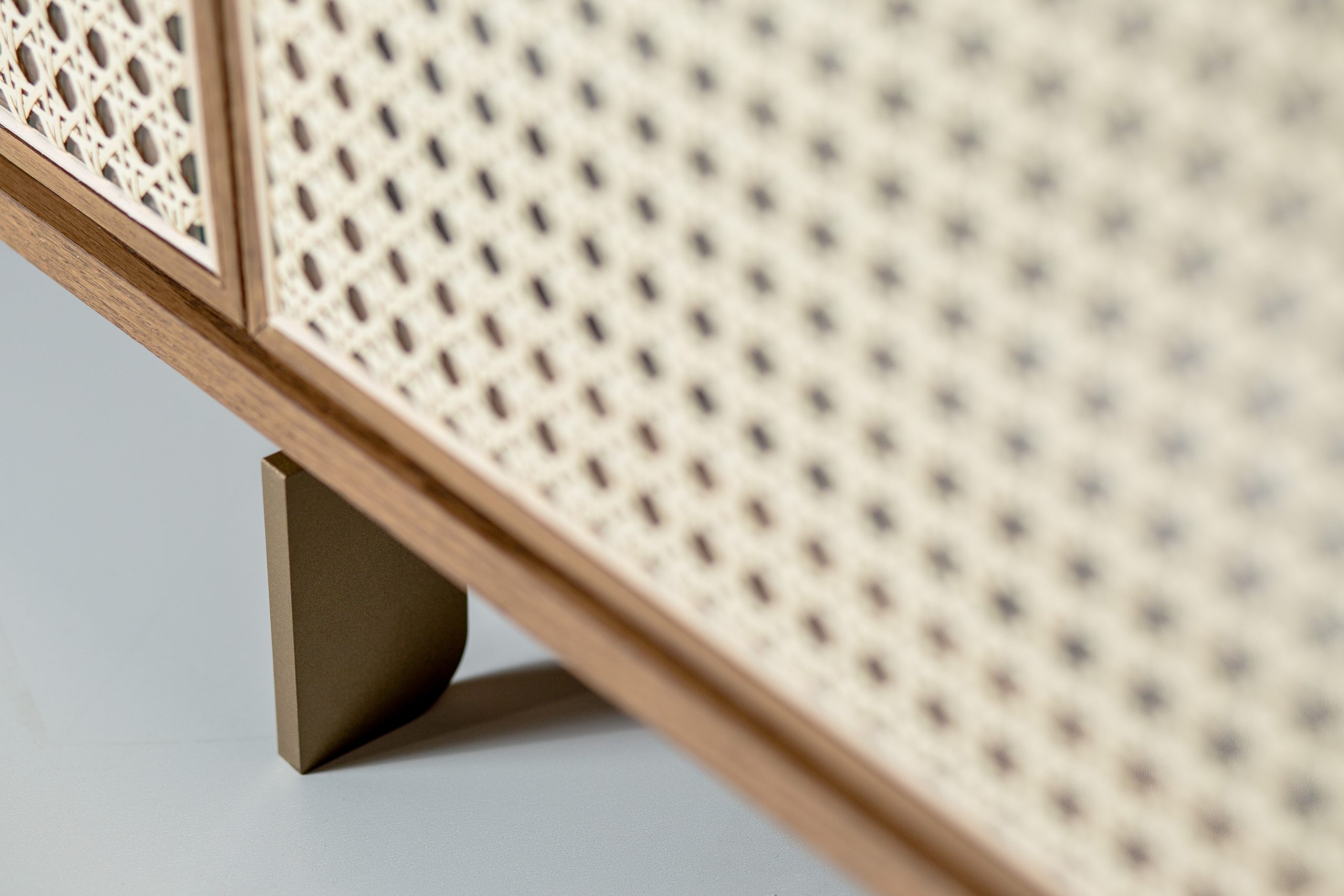 Material: Mdf laminado, Base com pintura metalizada no tom ônix ou dourado, com 4 portas em palha natural
