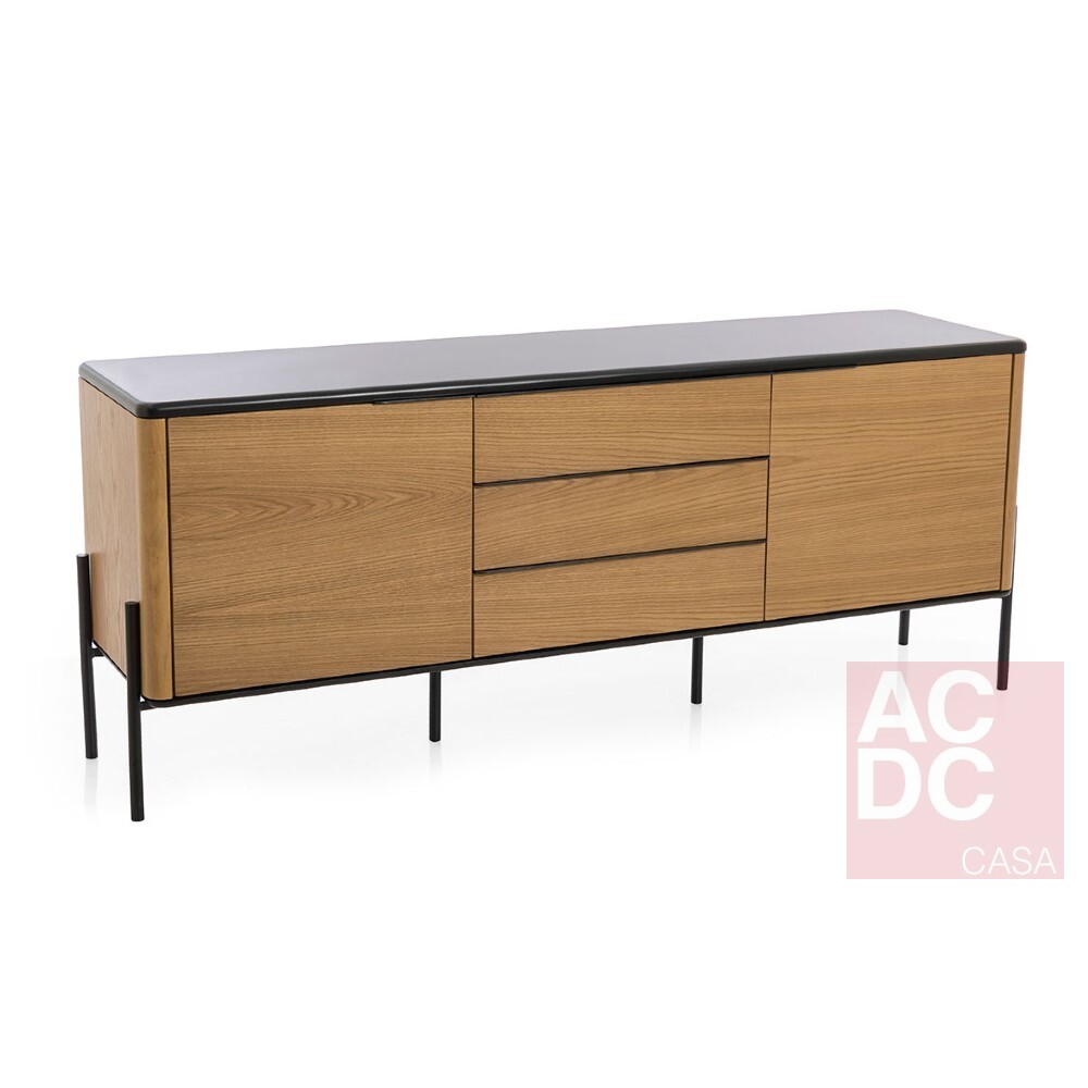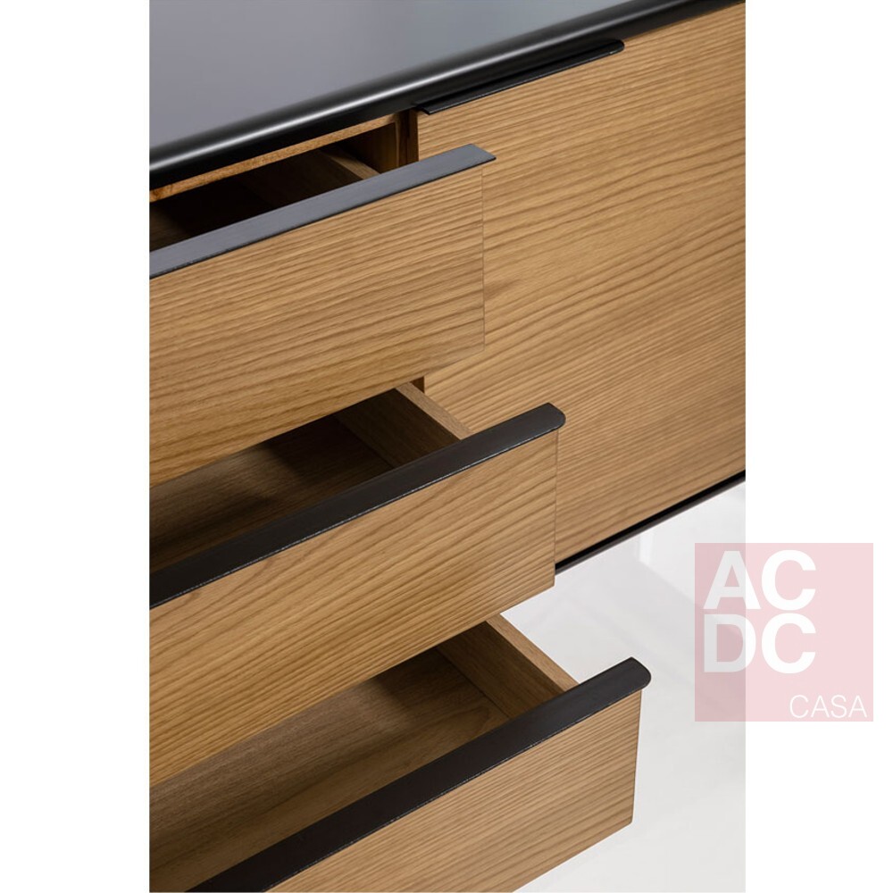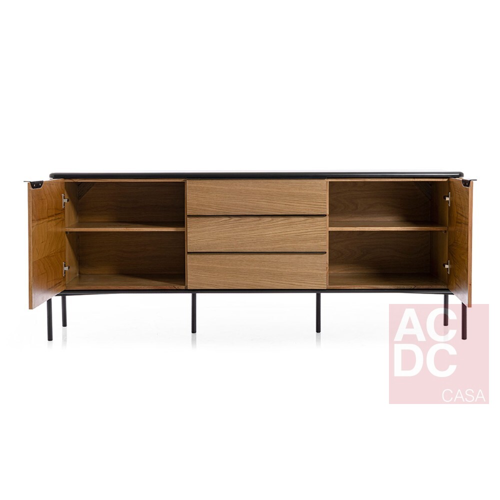 Equilíbrio, serenidade e contrastes são os três elementos usados como ponto de partida para a concepção do Buffet . Sua geometria busca nas linhas trazer paz ao olhar, ao mesmo tempo que seu contraste entre o liso e o texturizado, arredondado e o reto presentes em seus detalhes, convidam o observador a se aproximar e ter uma experiência mais tátil. Seu nome vem justamente das linhas horizontais, remetendo ao símbolo da pausa de semibreve utilizado em partituras, um simples traço que traz um momento de paz, respiro e ritmo em meio a uma bela composição. É confeccionado com tampo e base de MDF laqueado, estrutura em lâmina natural de madeira, pés em aço carbono e puxadores de alumínio.