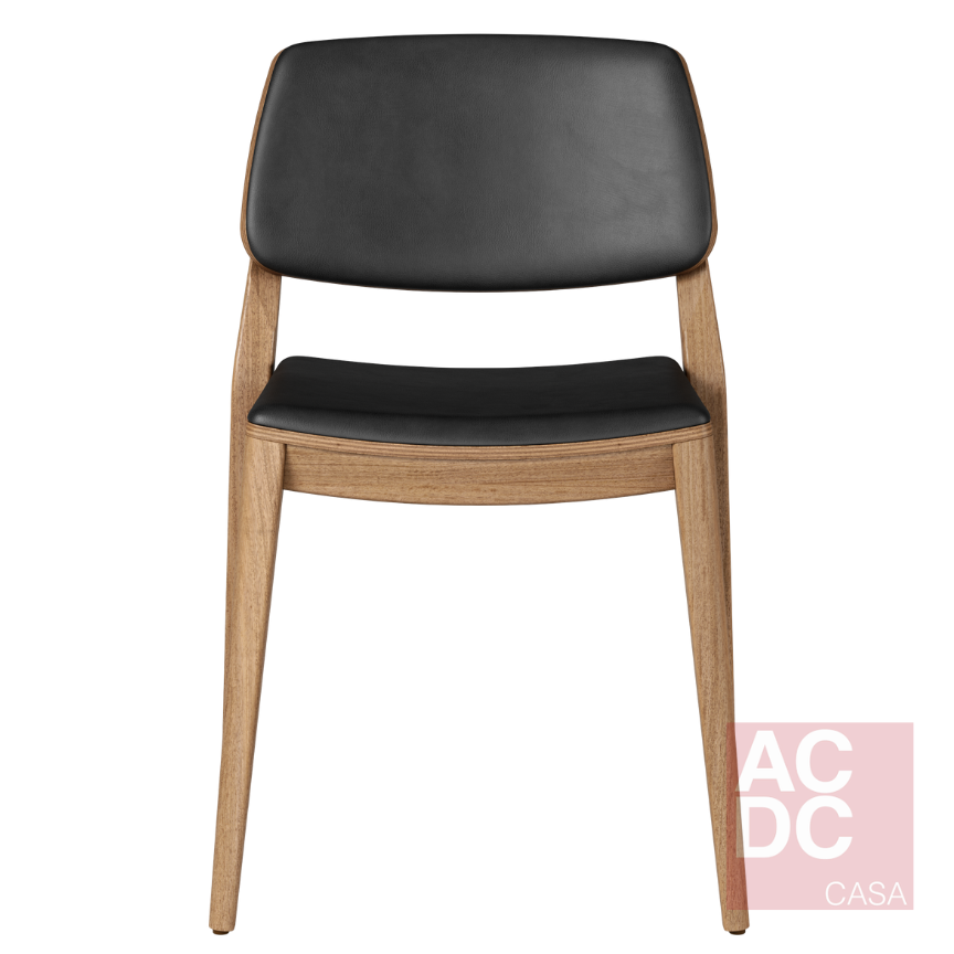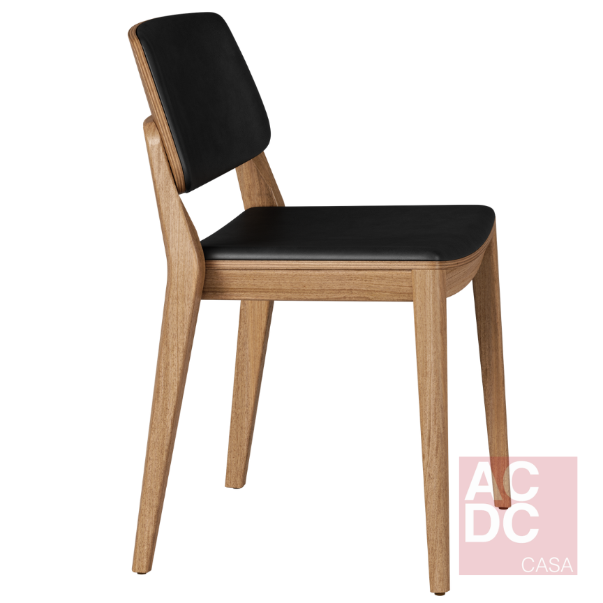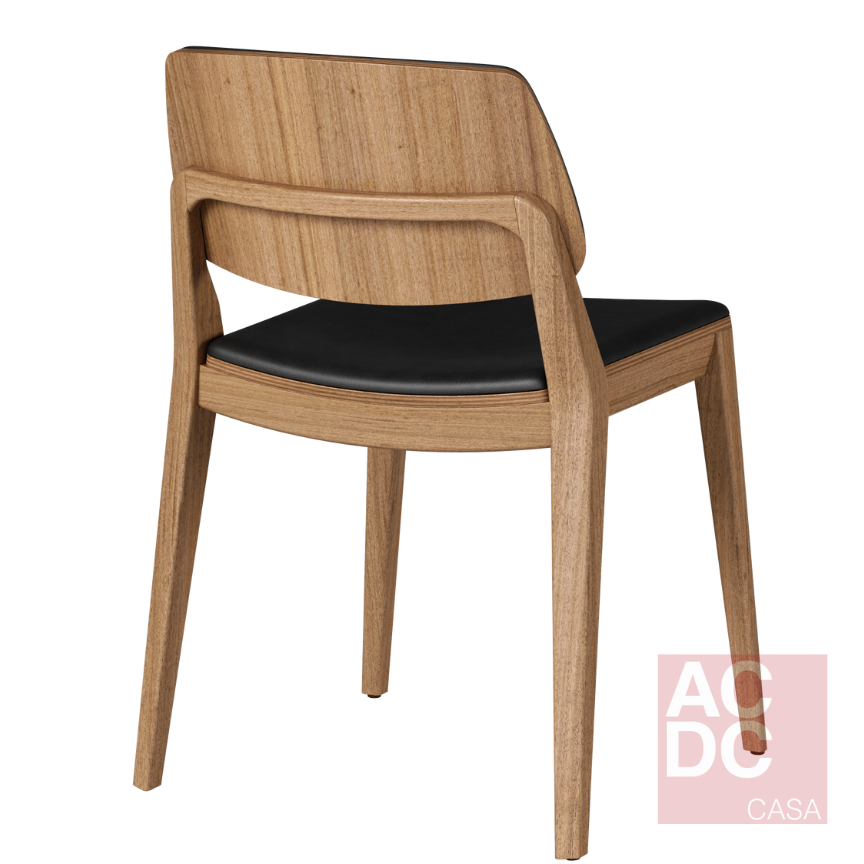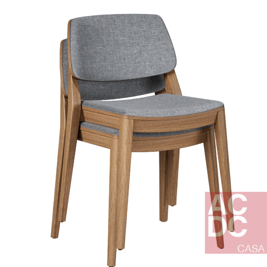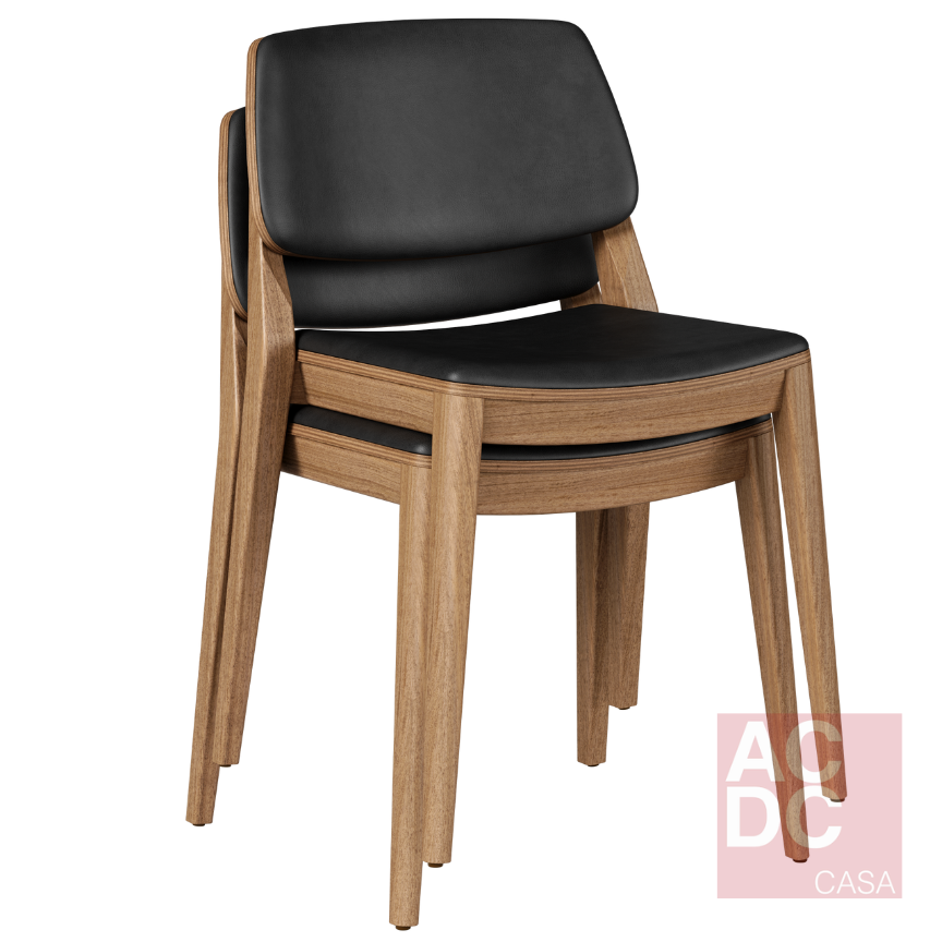 Cadeira empilhável. Estrutura em madeira maciça, assento e encosto estofado.
