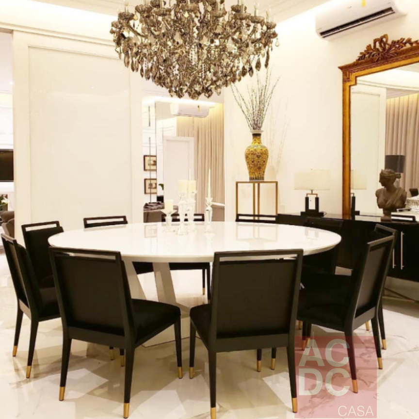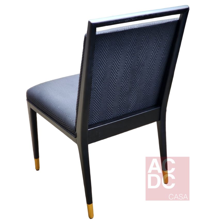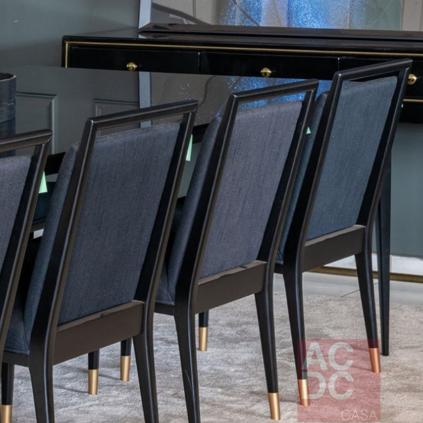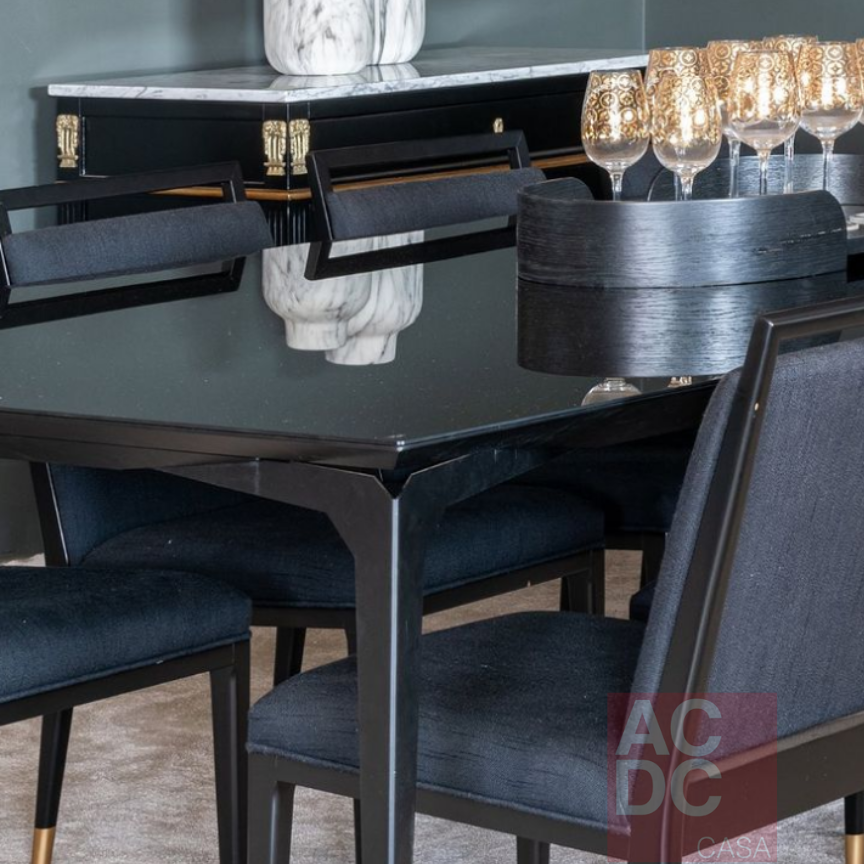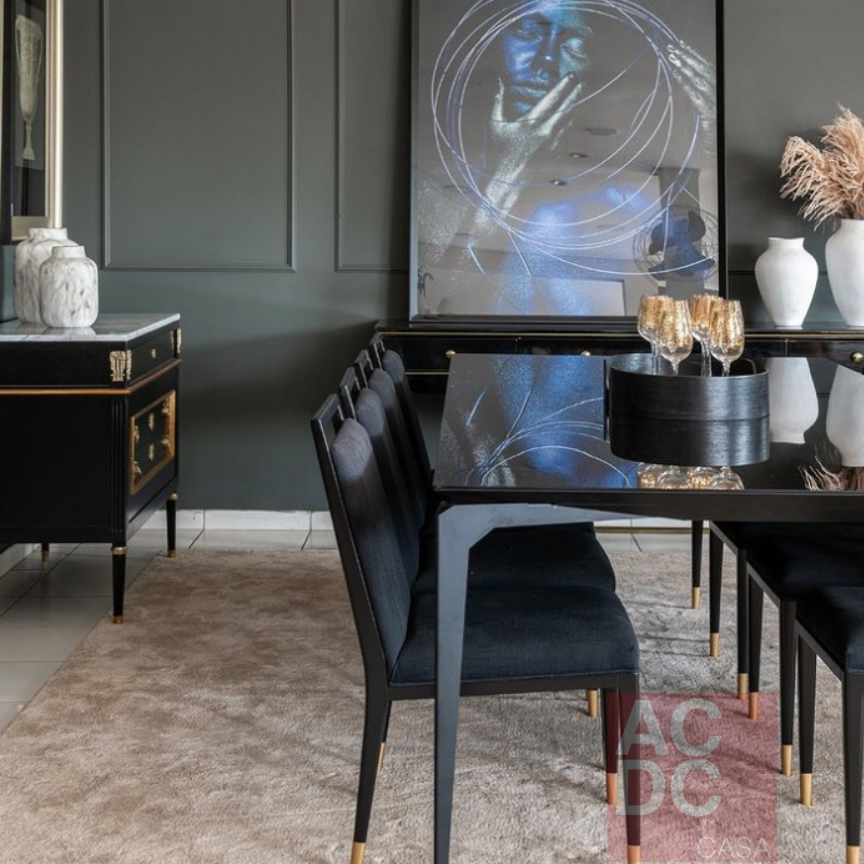 Material: Estrutura de madeira maciça ebanizada, estofada e base/ponteiras em dourado