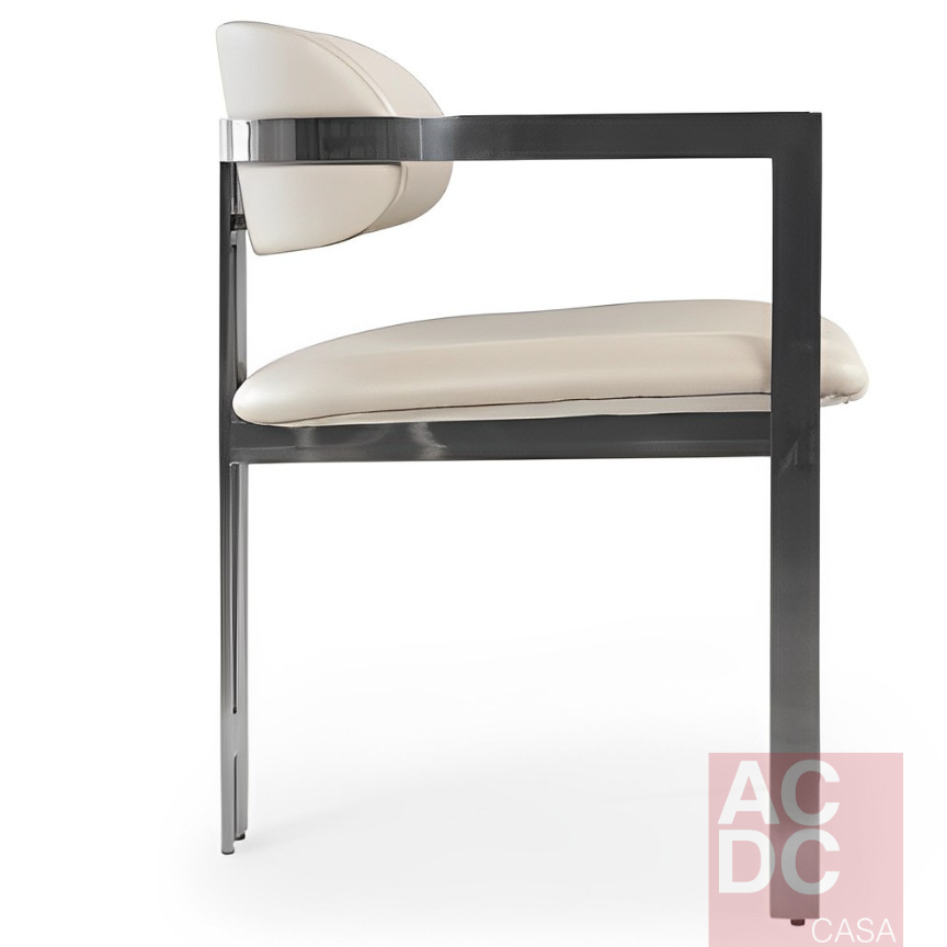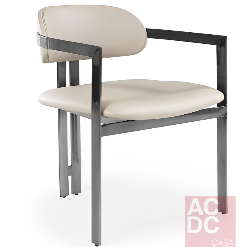 Material: Cadeira estofada em tecido PU e estrutura em Aço Inox – com braço