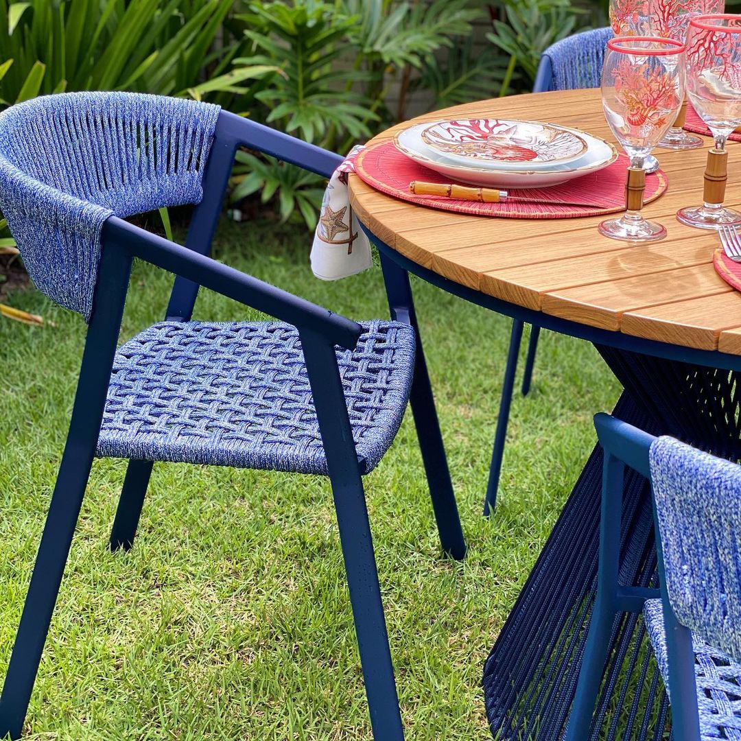 Material: Estrutura em alumínio tubular, com pintura eletrostática. Tecido repelente à água. Possui ótima durabilidade e resistência a fatores climáticos e proteção UV. e acabamento em corda Náutica