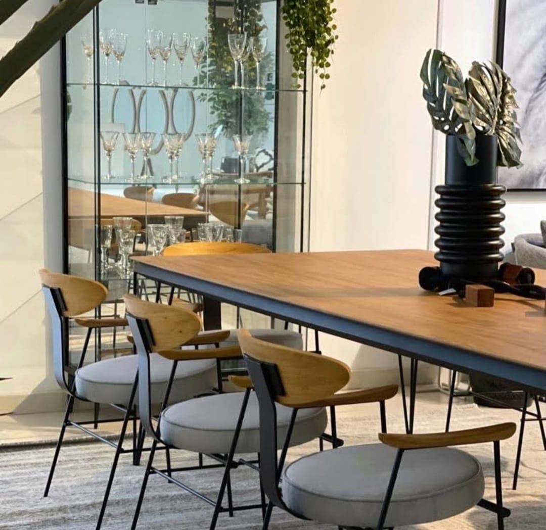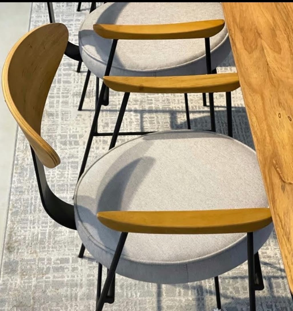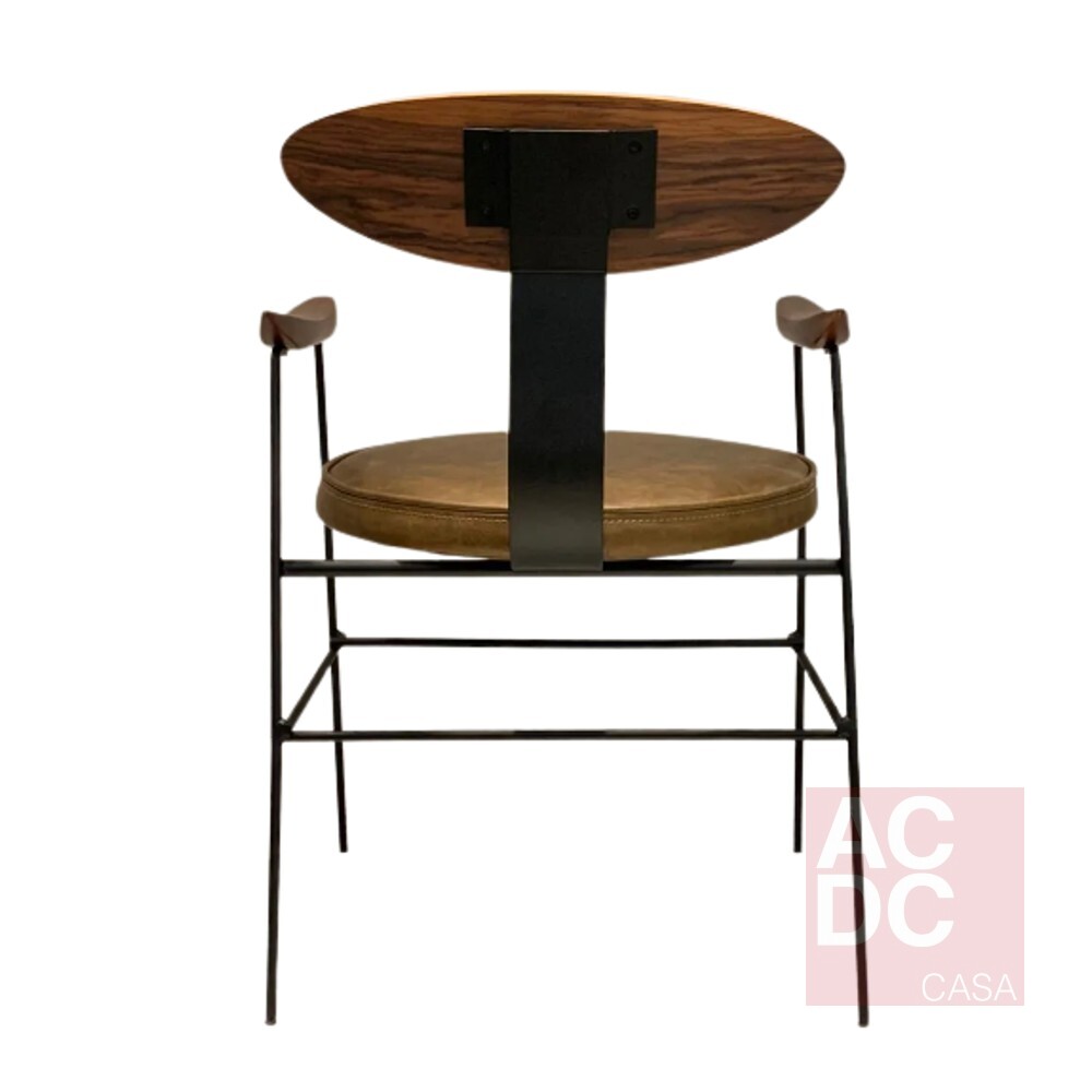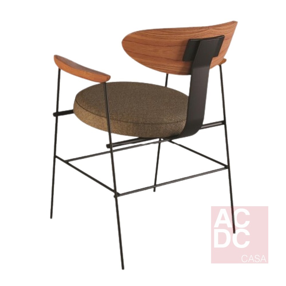Material: Estrutura em metal pintado, assento e encosto estofados e braços com madeira