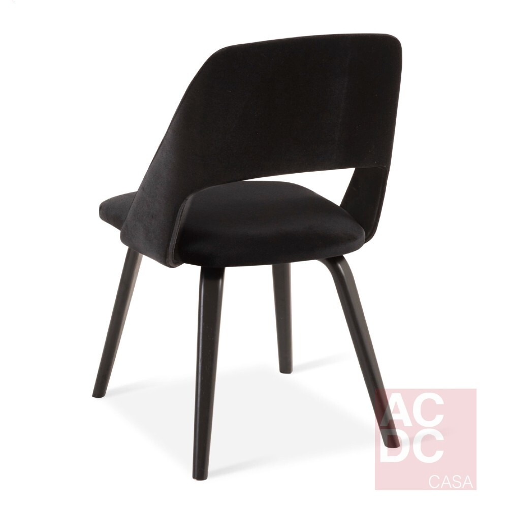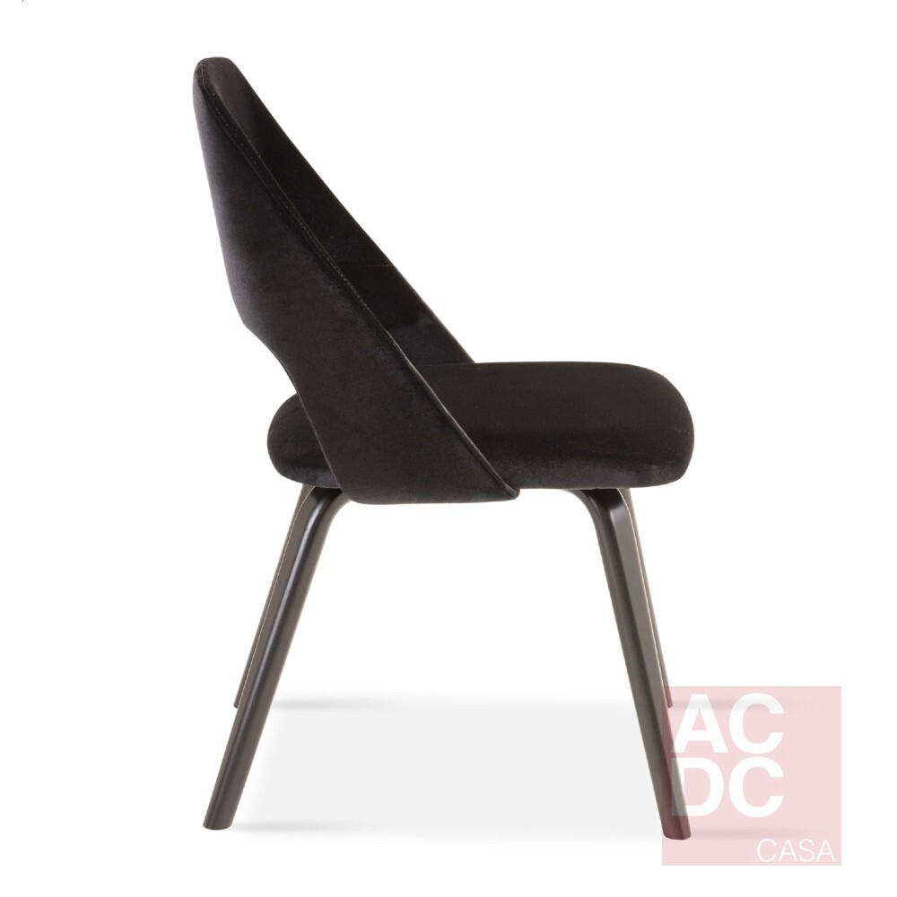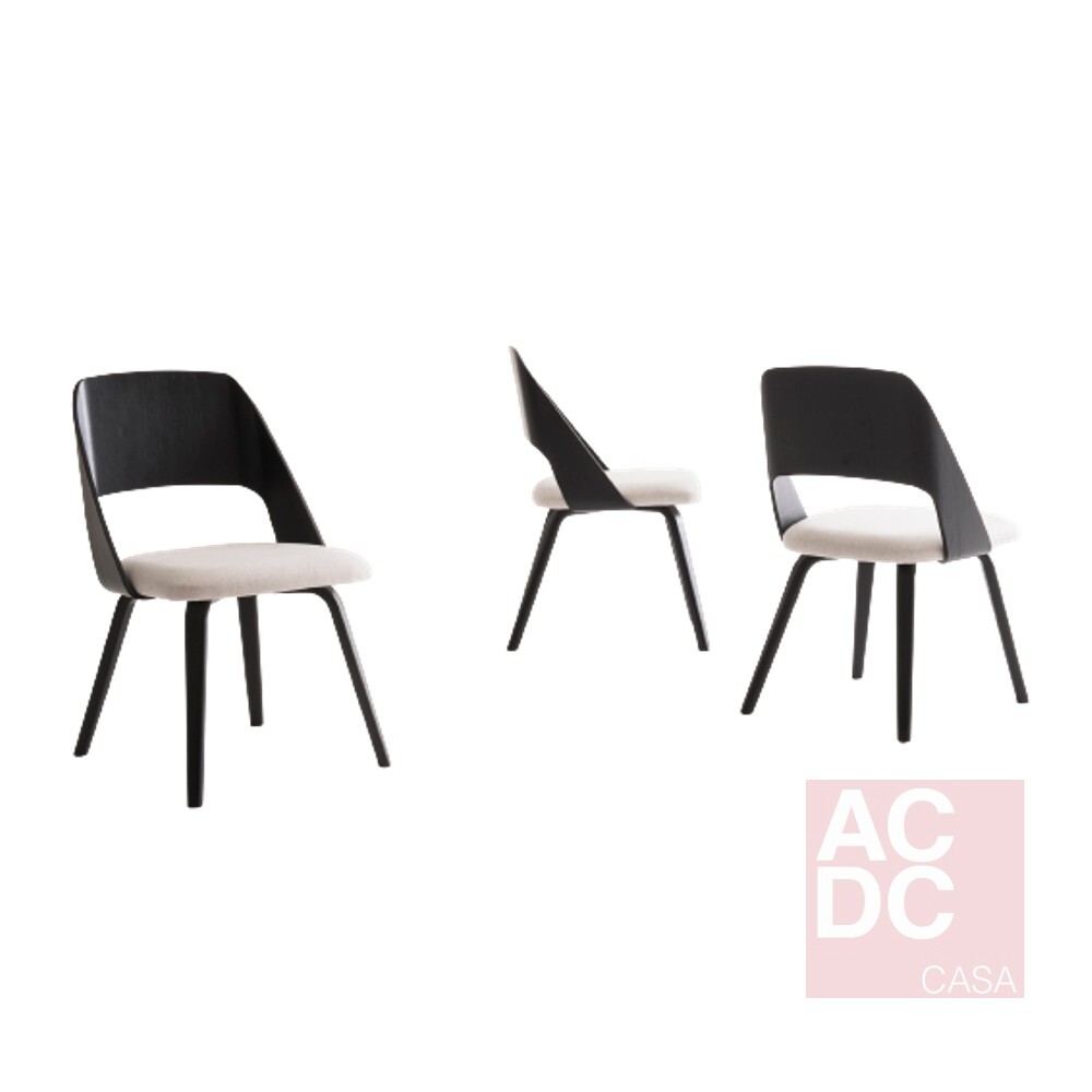 Material: Encosto em compensado curvo estofado que abraça o assento. Pés em compensado maciço curvo afixados direto a chapa do assento.