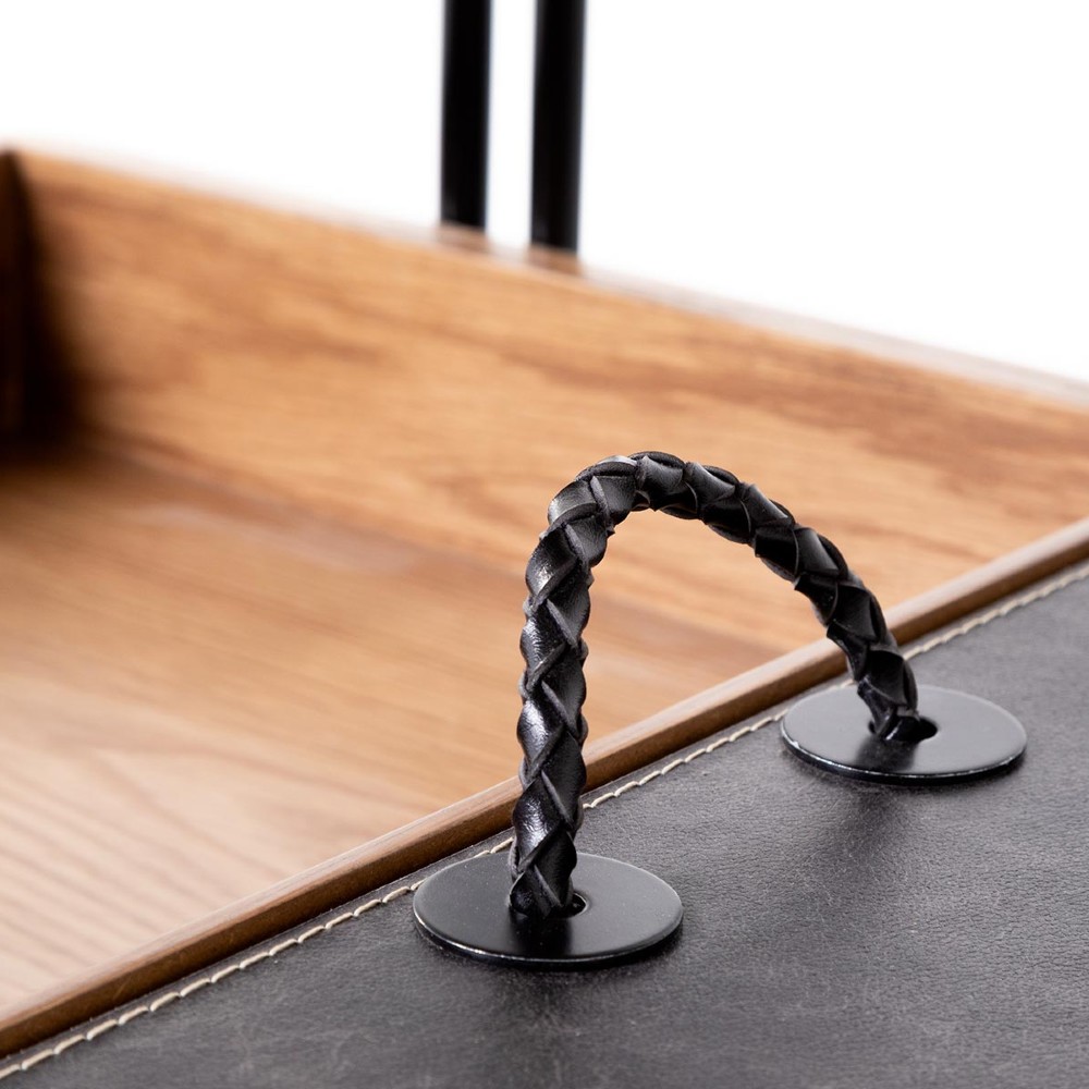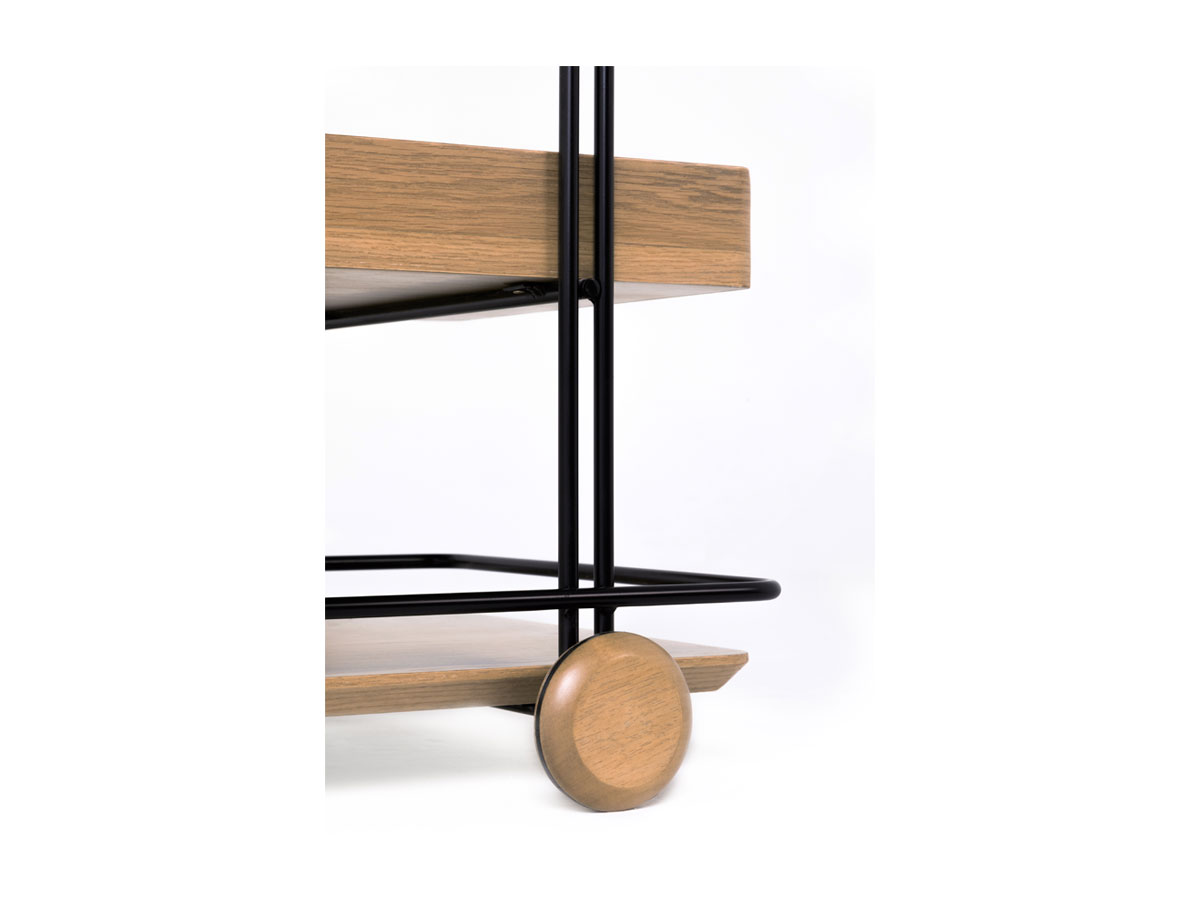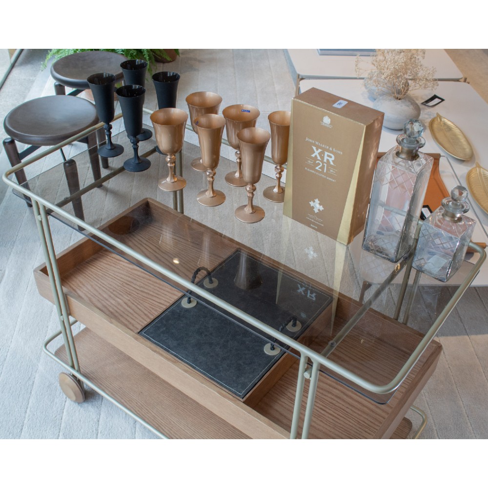 O bar Ádis é confeccionado com estrutura de aço carbono, tampo superior em vidro bronze, bandeja central e tampo inferior em MDF revestido com lâmina natural de madeira, rodas em madeira maciça e baú com tampa revestida em recouro.