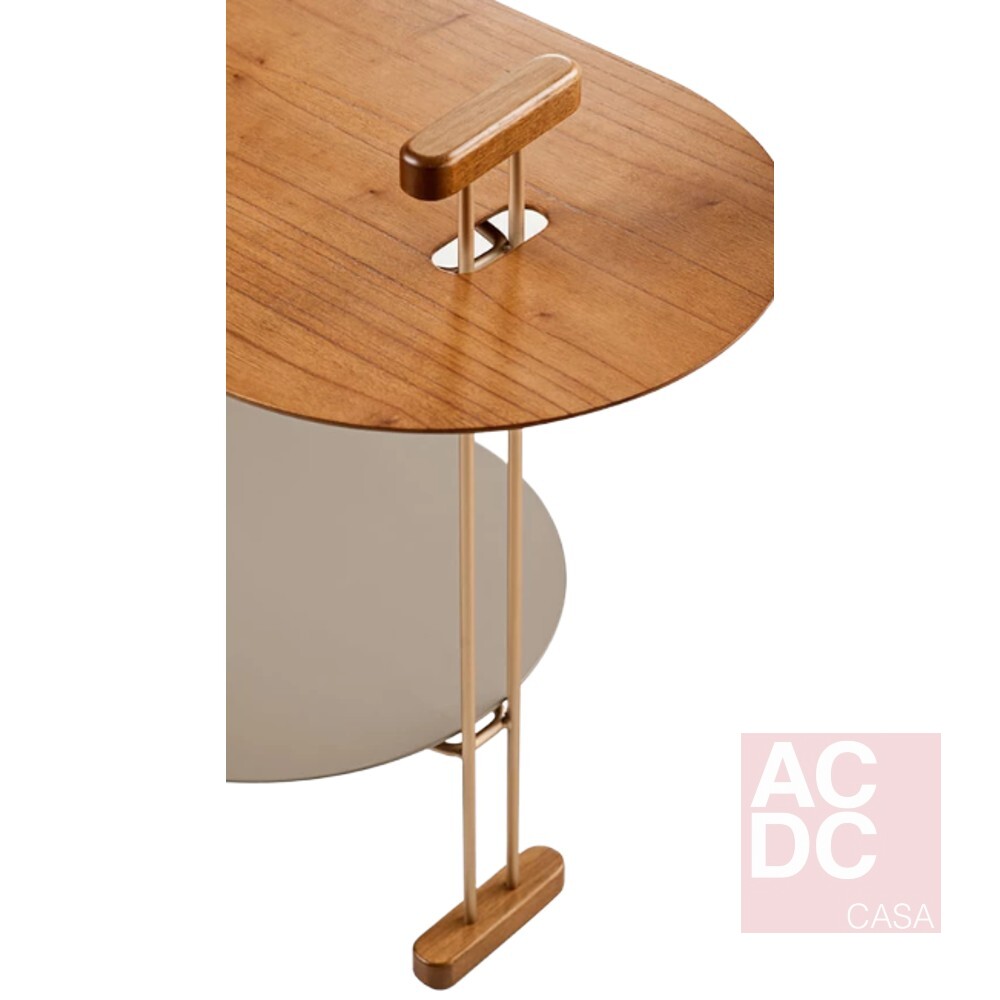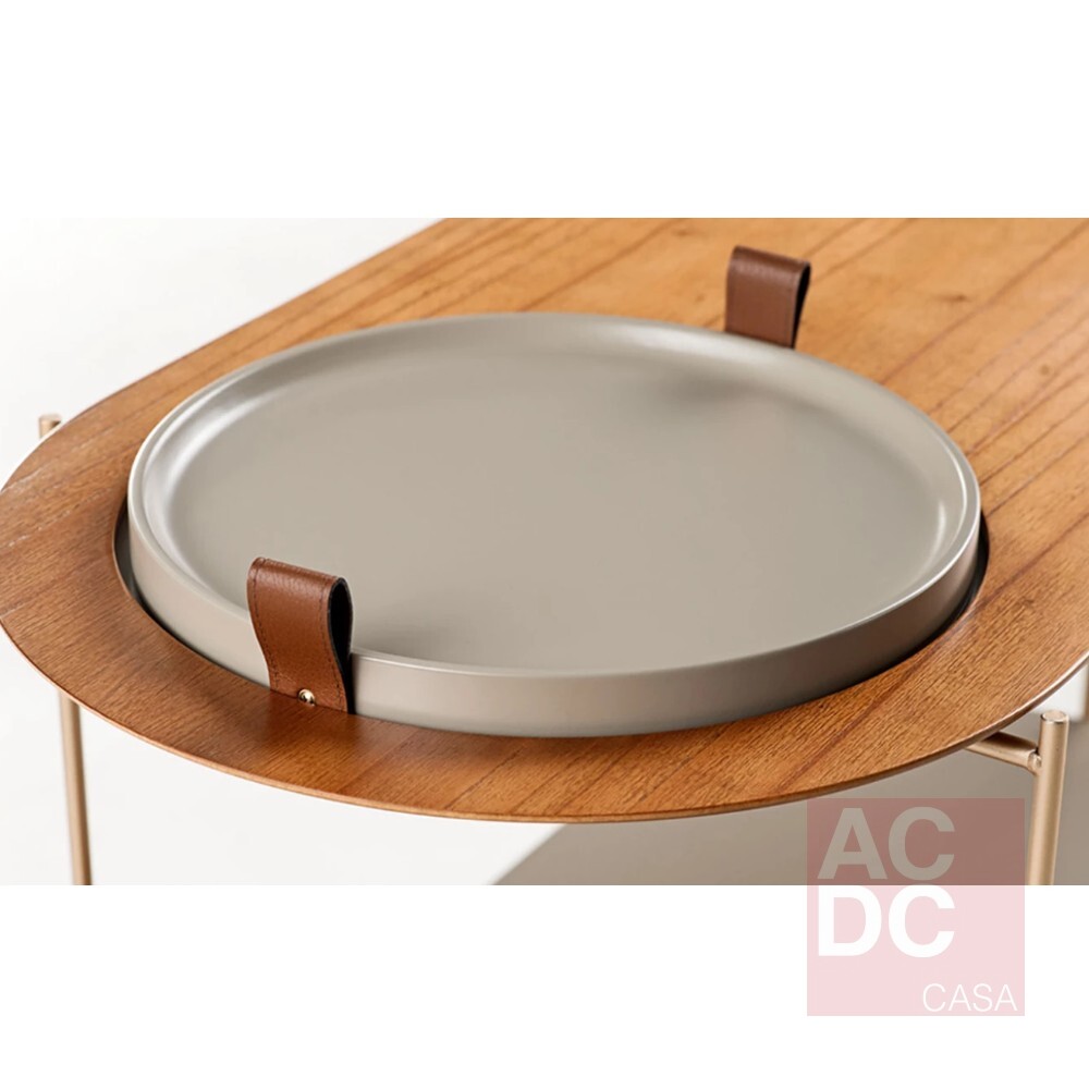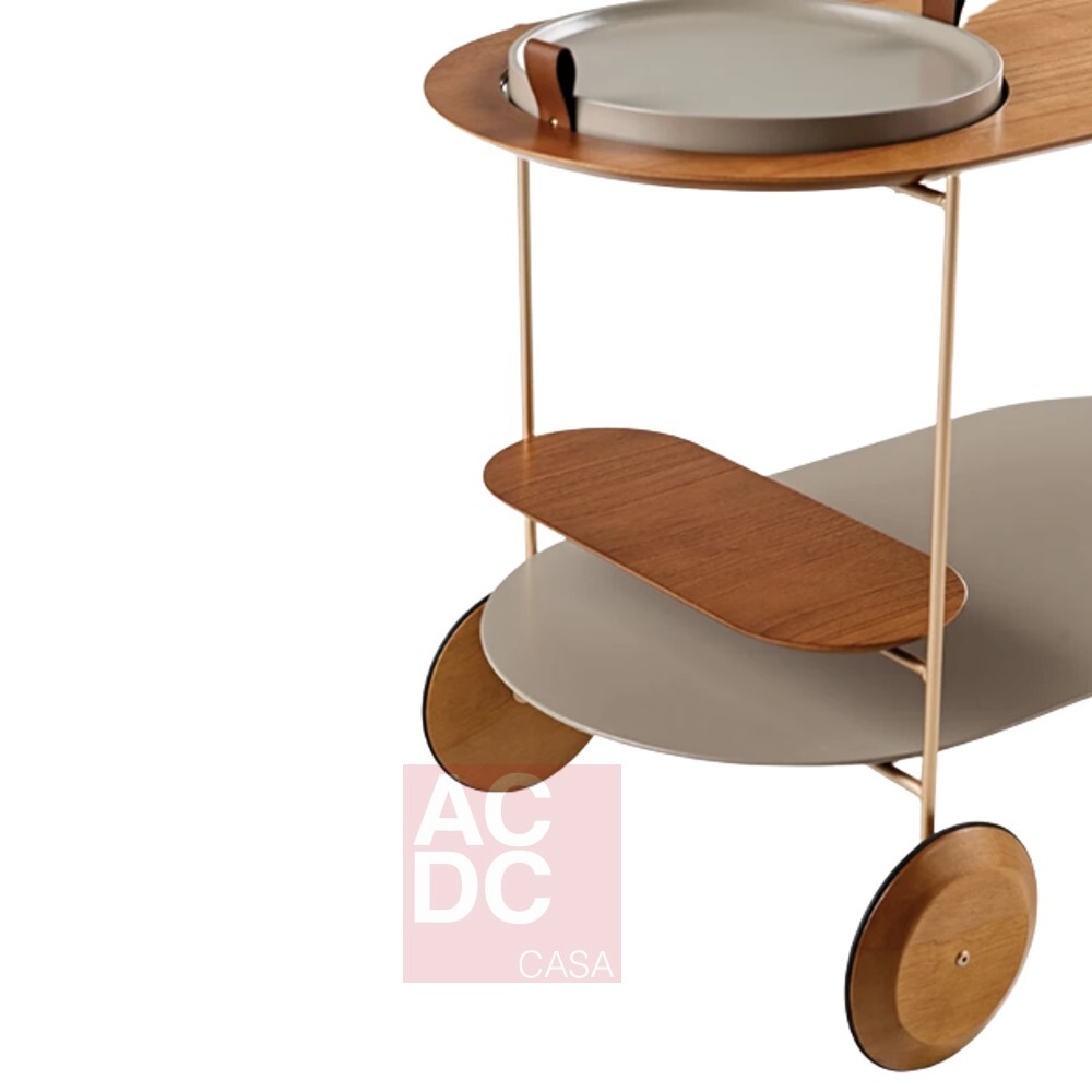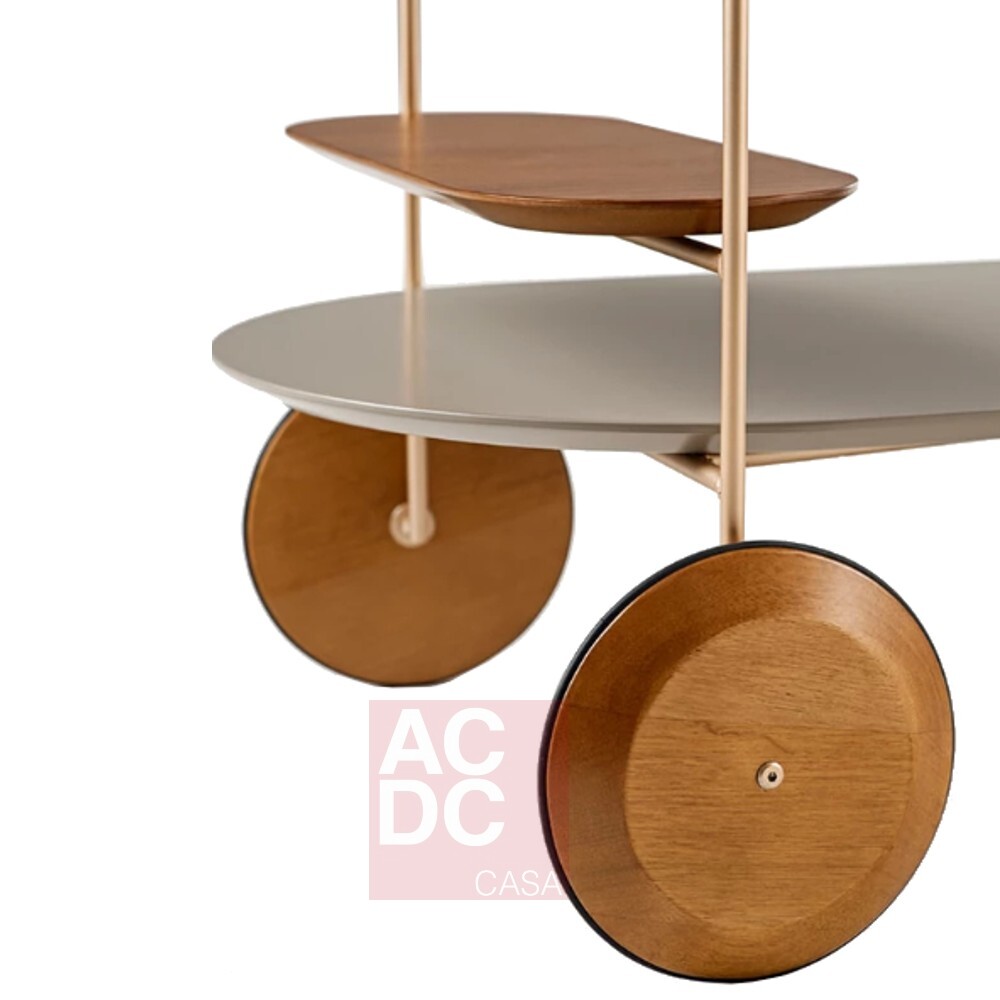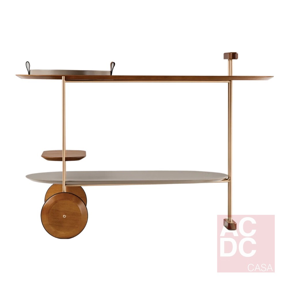 Infinitas possibilidades de configuração podem ser geradas no carro bar Kiarte que surpreende pela mistura de diferentes materiais, acabamentos e detalhes, provocando característica única repleta de significado e atração. Estrutura metálica. Rodas, bandeja e o pegador são produzidos em madeira maciça de tauari. Tampos em MDF revestido com lâmina natural de madeira cinamomo. Alças da bandeja feita em couro reconstituído disponível na cor marrom e preta.