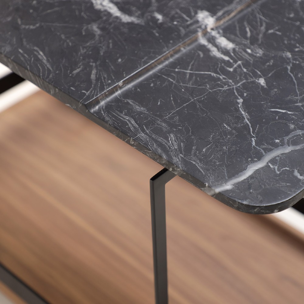 A) Base laqueada fosca, Tampo inferior laminada (Ebanizado / Freijó / Jequetibas / Louro Negro / Nogueira) e Tampo superior mármore, / B) Base laqueada fosca, Tampo inferior laqueado fosco e Tampo superior mármore.