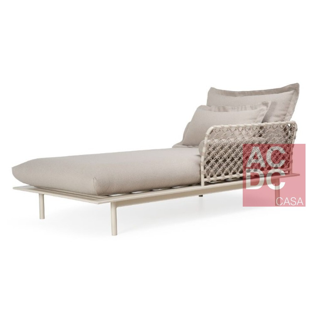 Material: Estrutura em alumínio com pintura eletrostática. Revestimento em tecido e acabamento artesanalmente tramado em corda náutica.  Assento estofado com características sintéticas. Acompanha uma almofada rineira e uma almofada de rolinho.