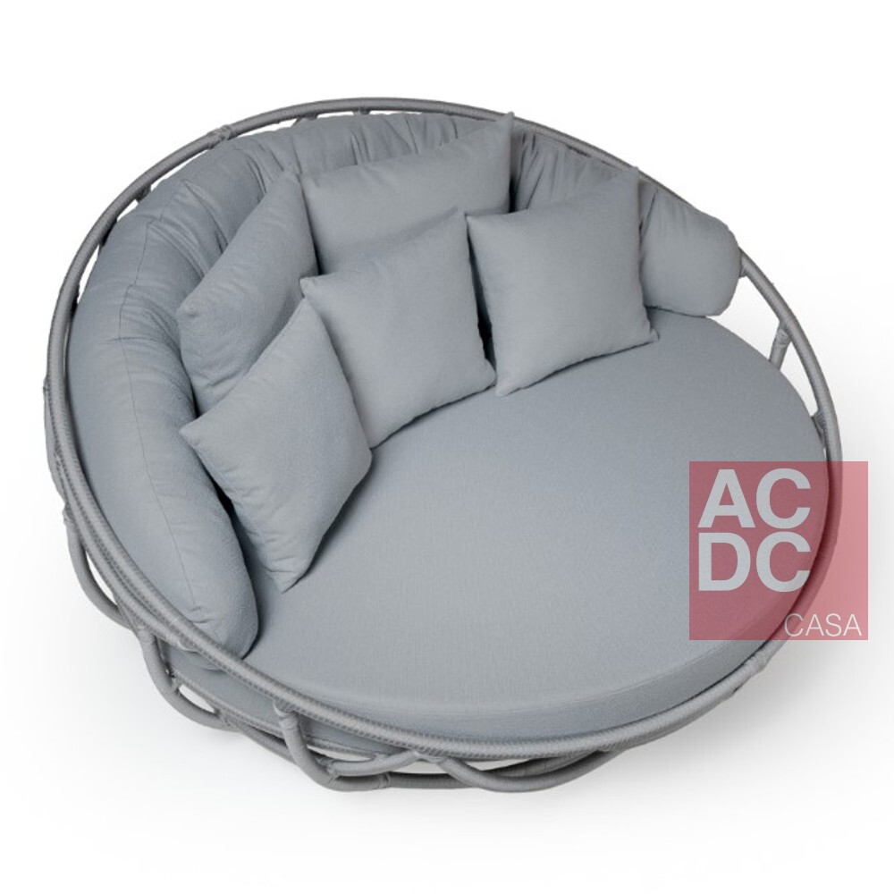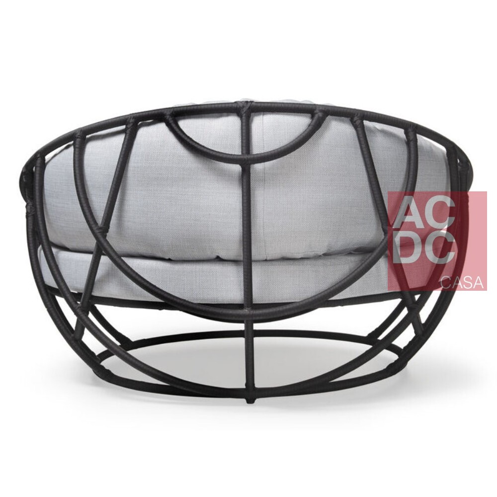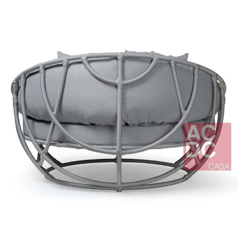 O assento é estofado em espuma D28 com manta acrílica, e as almofadas possuem fibra sintética, ambos possuem características que secam com facilidade quando expostas à chuva.