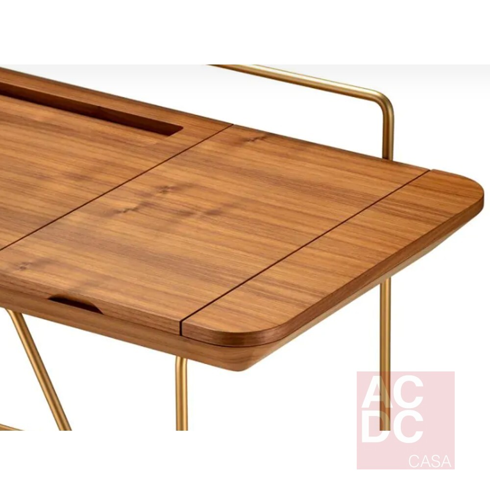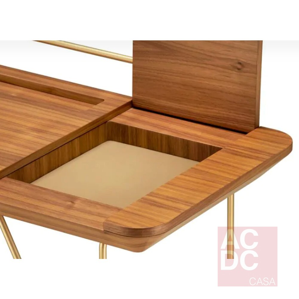 Material: Estrutura em aço carbono com laca metalizada, tampo em lâmina carvalho mel, tampa para porta jóias forrada em couro
