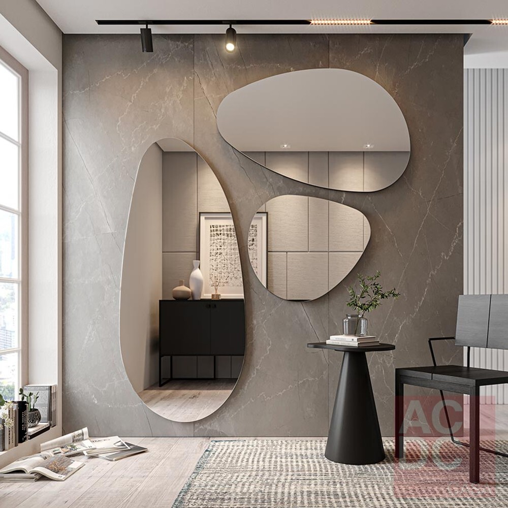 O conjunto de espelhos possui base de MDF laqueado. Dois penduradores na face posterior, permitindo que os espelhos sejam instalados na vertical ou na horizontal.