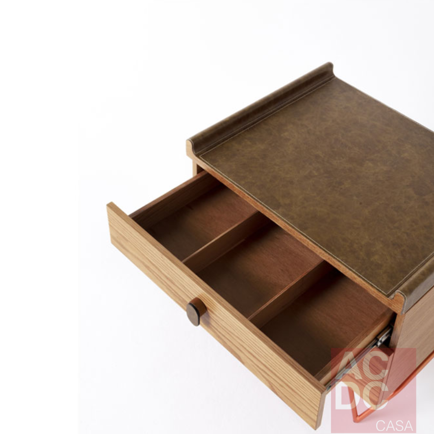 Material: MDF revestido com lâmina natural de madeira e pés de aço carbono. Dispõe de gaveta com corrediças telescópicas e espaço multifuncional em sua base.