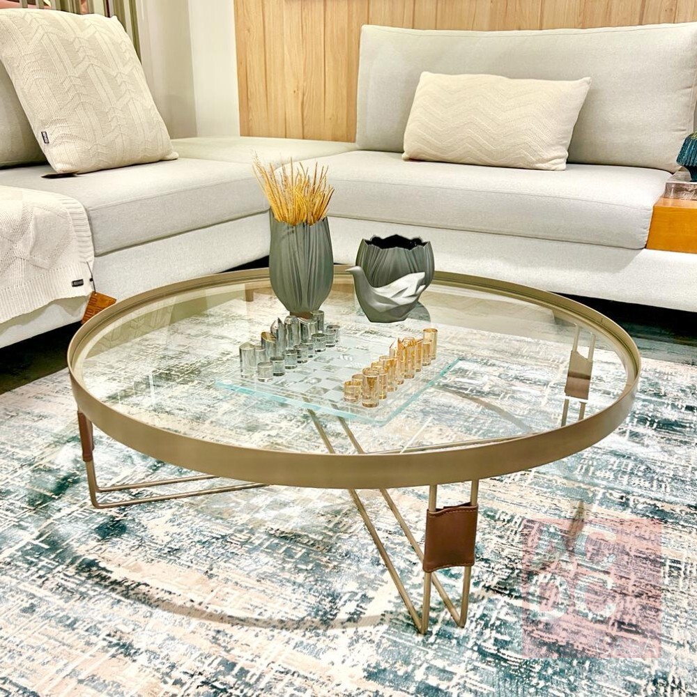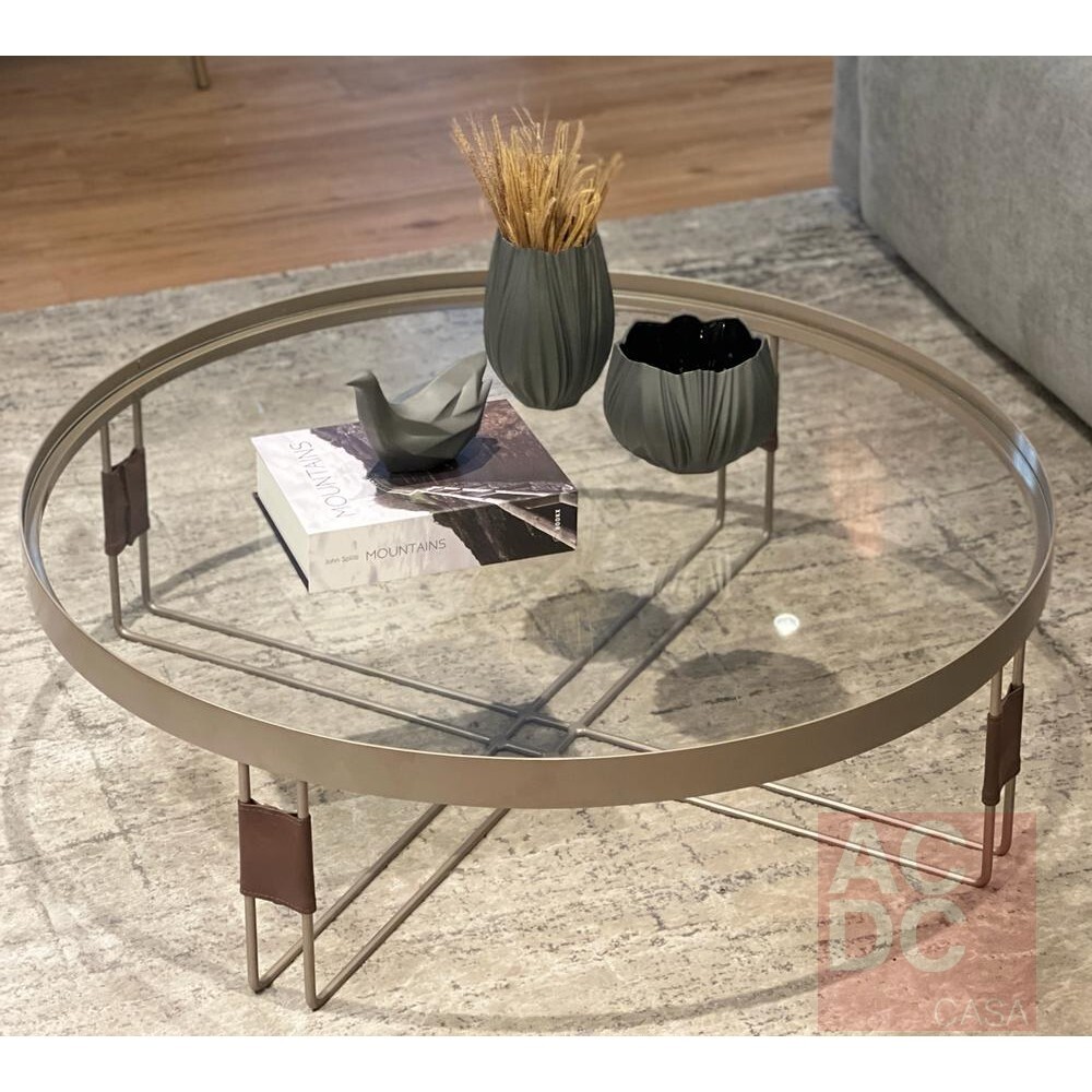 Material: Tampo redondo em vidro incolor, estrutura em aço carbono pintado e detalhes em couro sintético