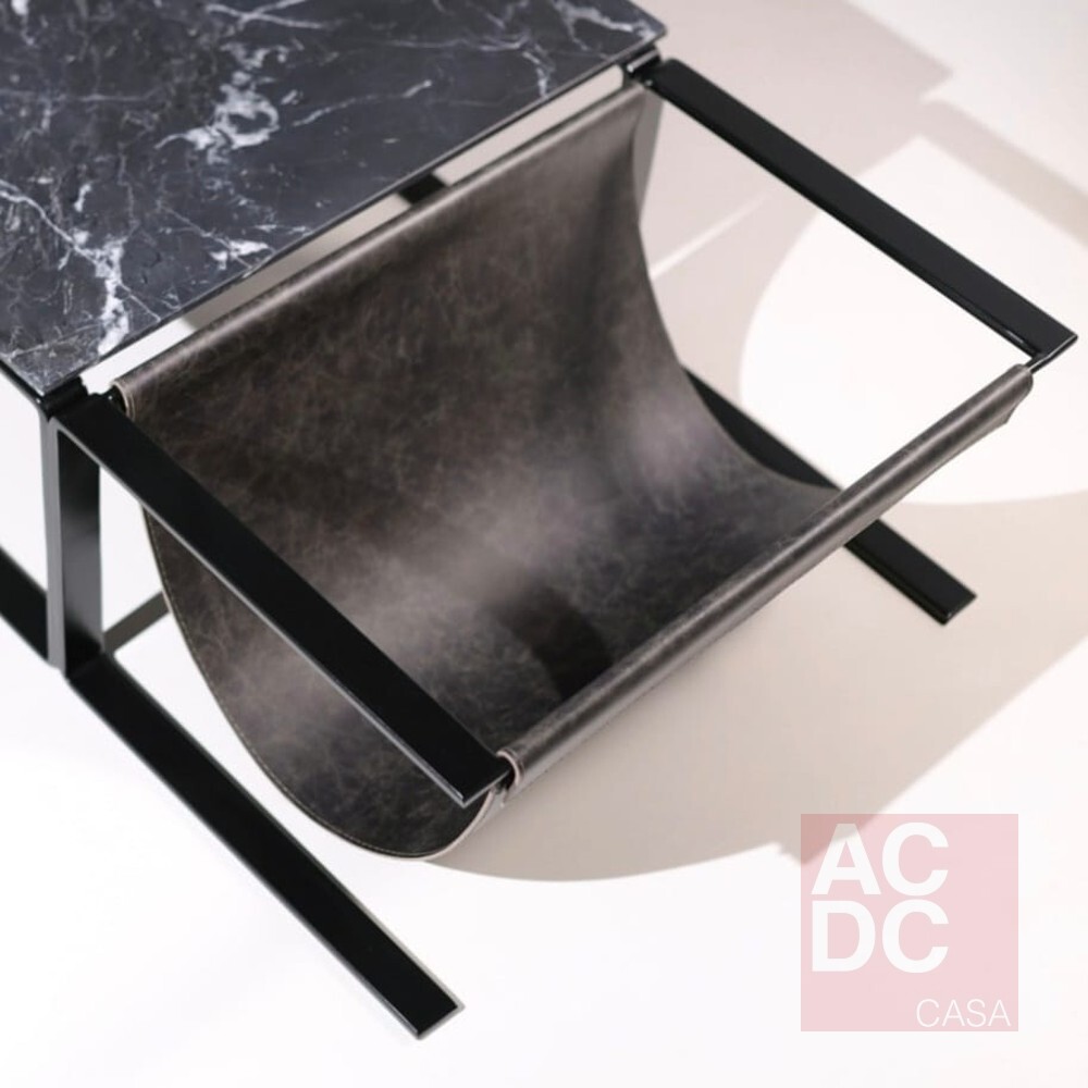 Material: Estrutura laqueada fosco, tampo em mármore e revisteiro em recouro