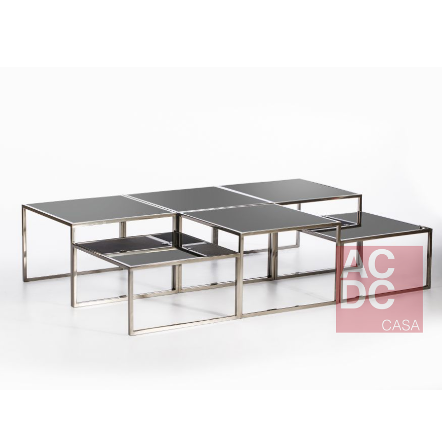 Mesa de centro decorativa com a base em aço inox. O tampo pode ser em espelho prata ou vidro preto. Mesas vendidas separadamente.