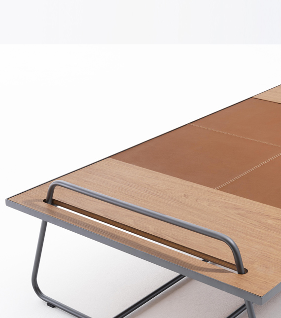 O destaque fica por conta do pé de metal que atravessa o vazado do tampo, criando uma troca de planos e servindo como alça para carregar a mesa.