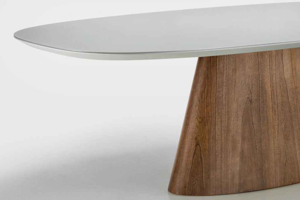 Material:  Tampo em tamburato CHANFRADO com espessura de 40mm com vidro colado e Estrutura da base em MDP/MDF laminado madeira