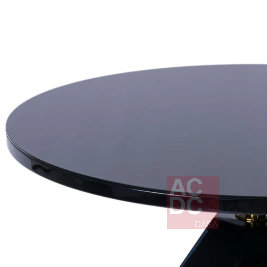 Material: Base ; estrutura em MDF haste em metal, tampo em laca preto pintado com vidro