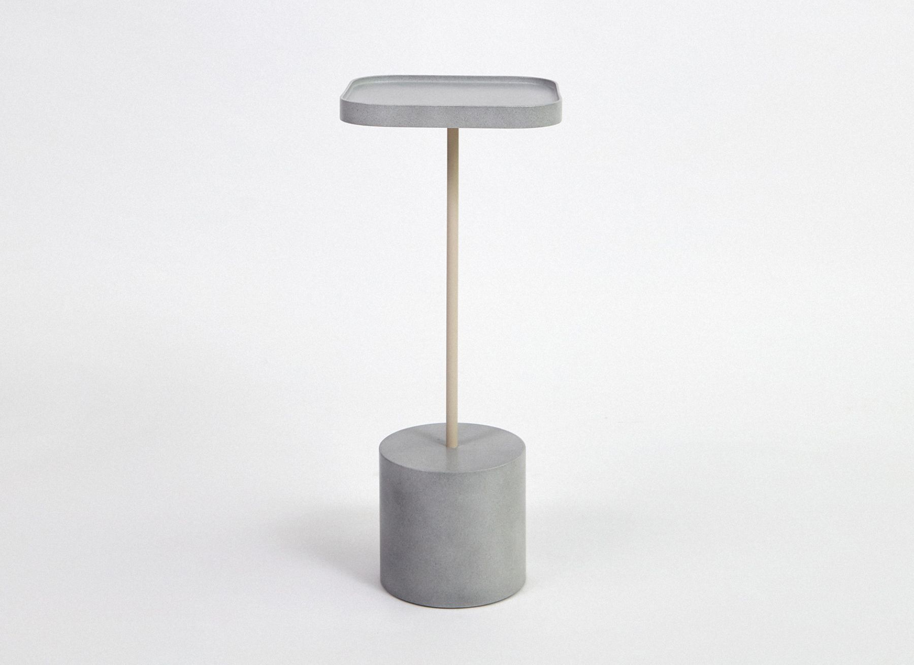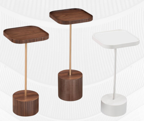 Material: Mesa lateral em nogueira, tampo bandeja com detalhes nos pés em metal