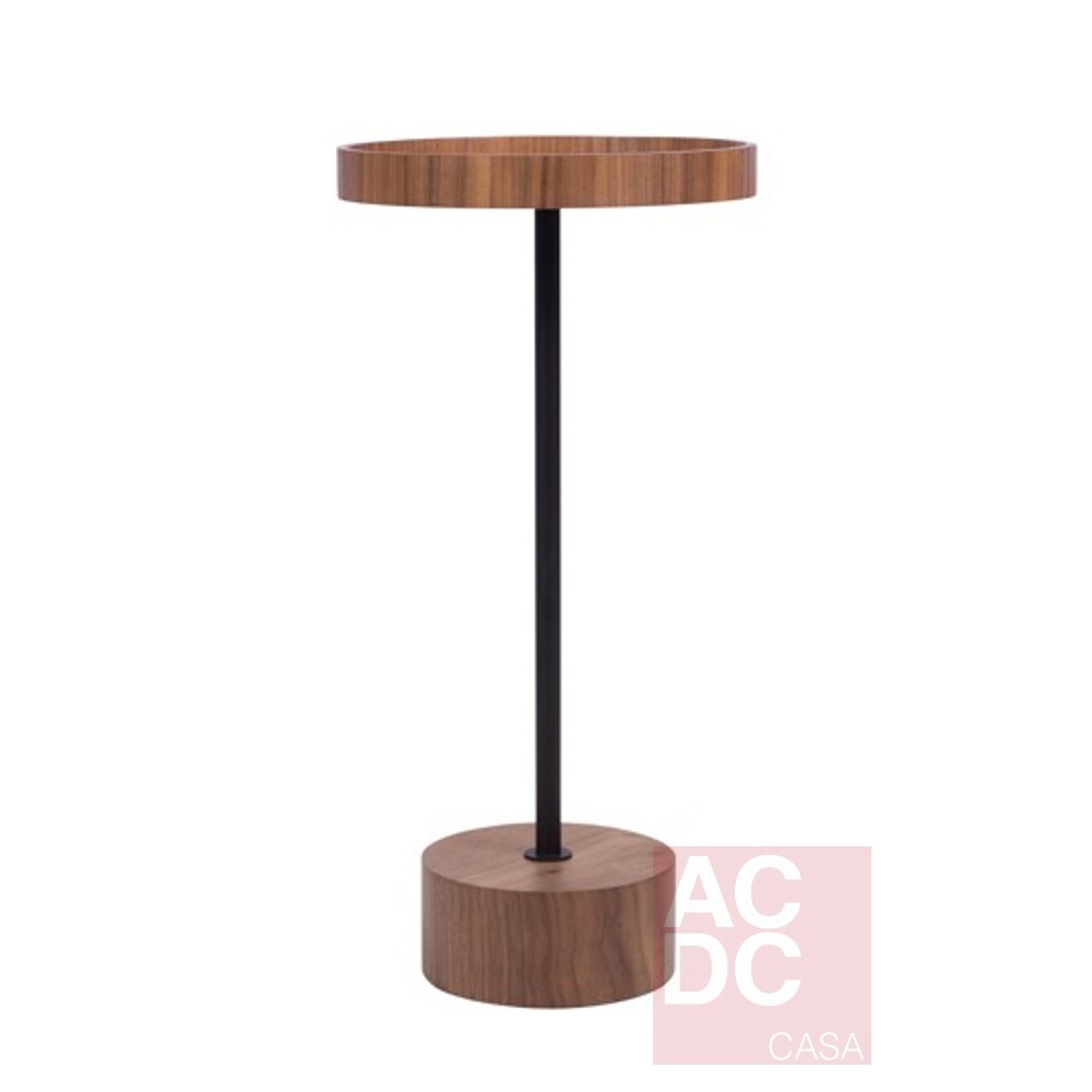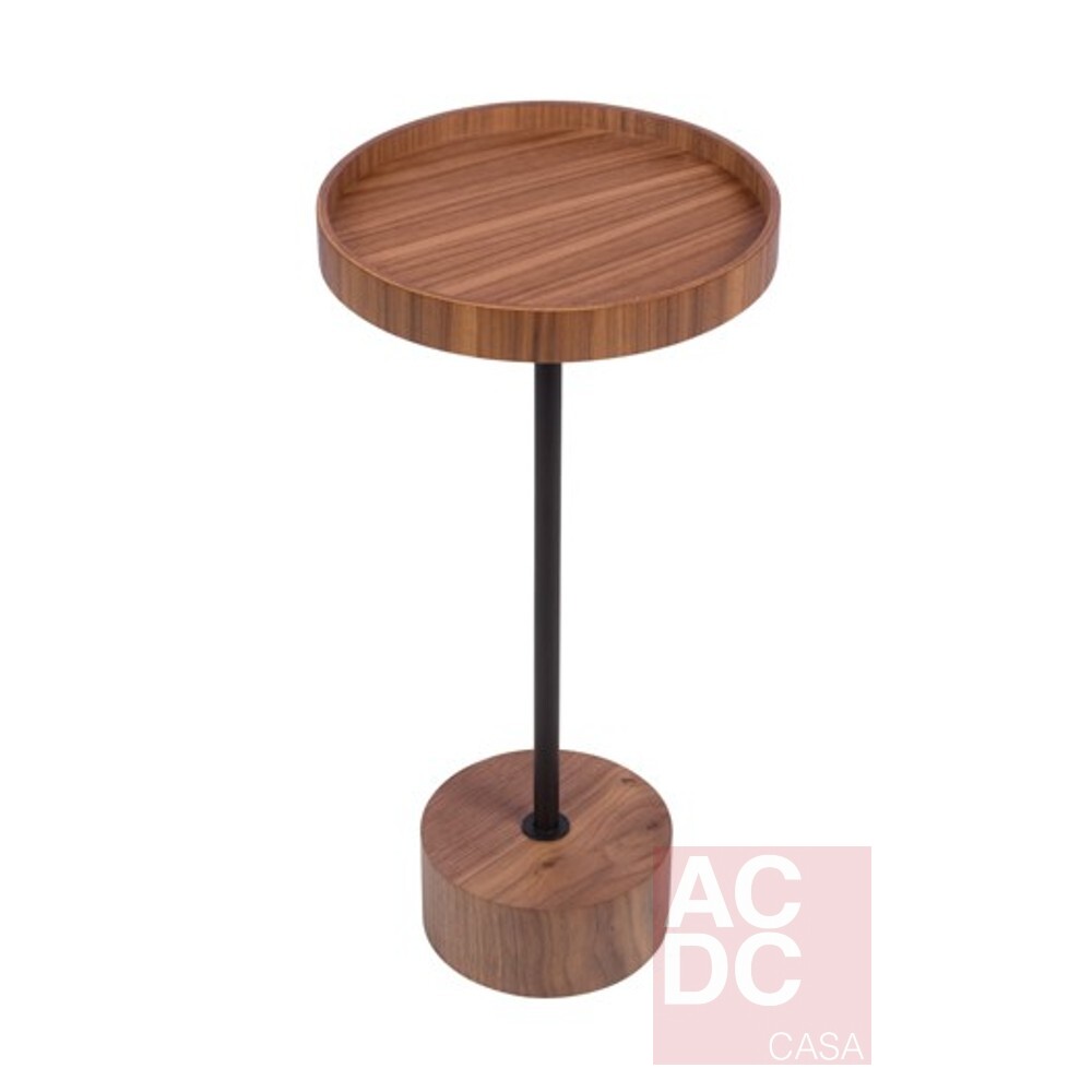 Material: Mesa lateral em nogueira, tampo bandeja com detalhes nos pés em metal