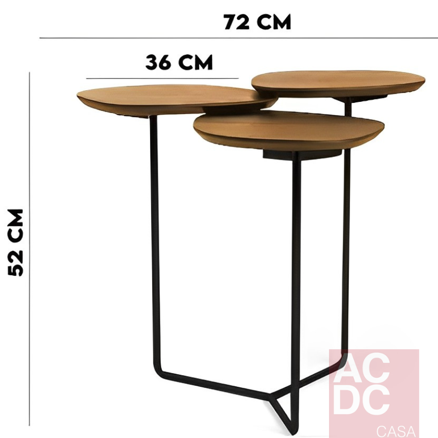 Estrutura em aço com acabamento metalizado, banhado em latão . Tampos com lâmina de carvalho