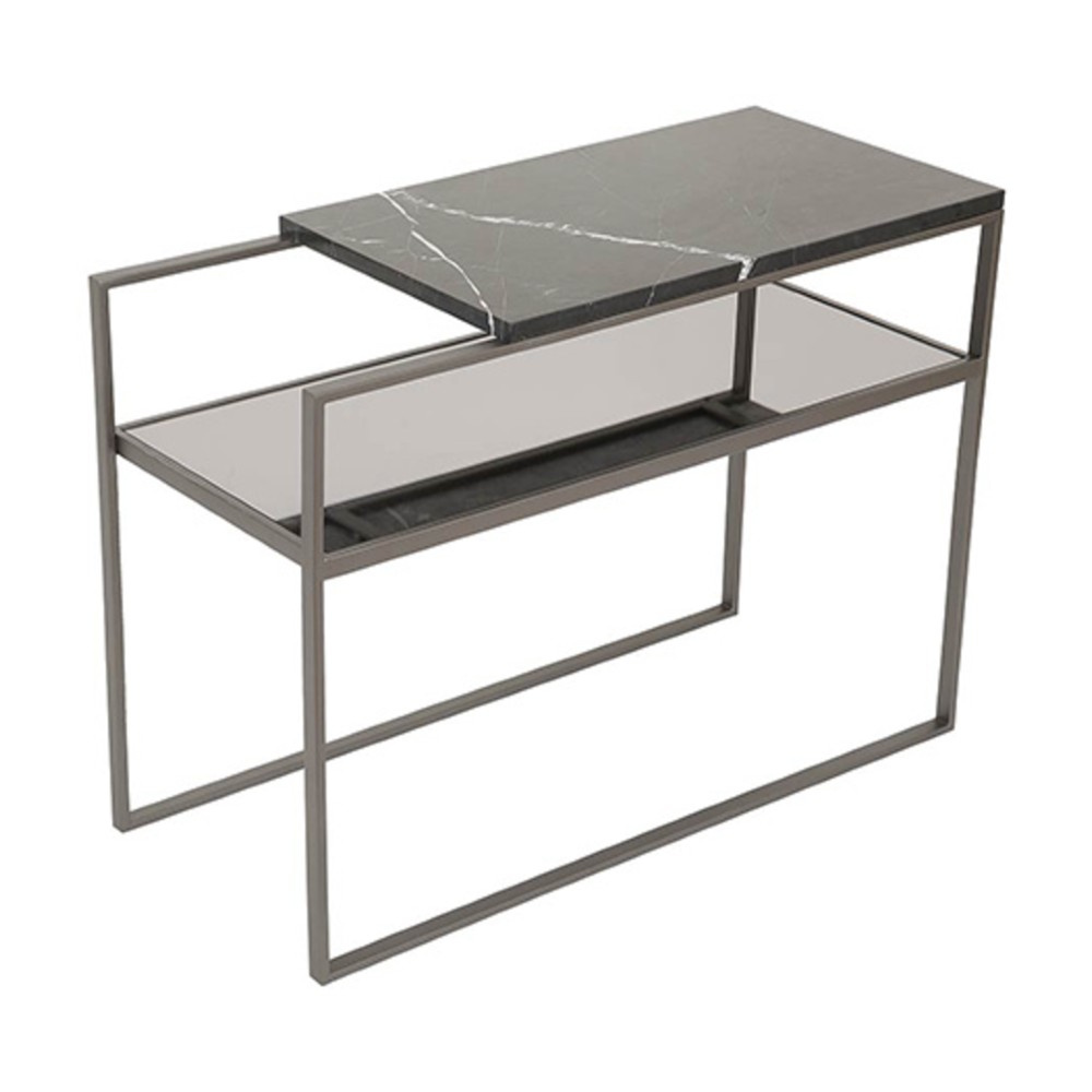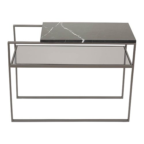 Material: Estrutura em aço inox prata , mármore nero marquina e espelho fumê.