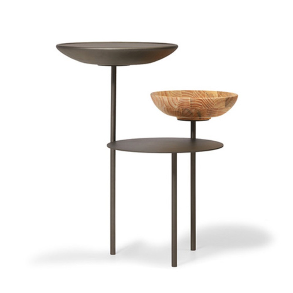 Material: Bowl em madeira pinus, base em aço carbono e tampo inferior em metal pintado e tampo superior em madeira