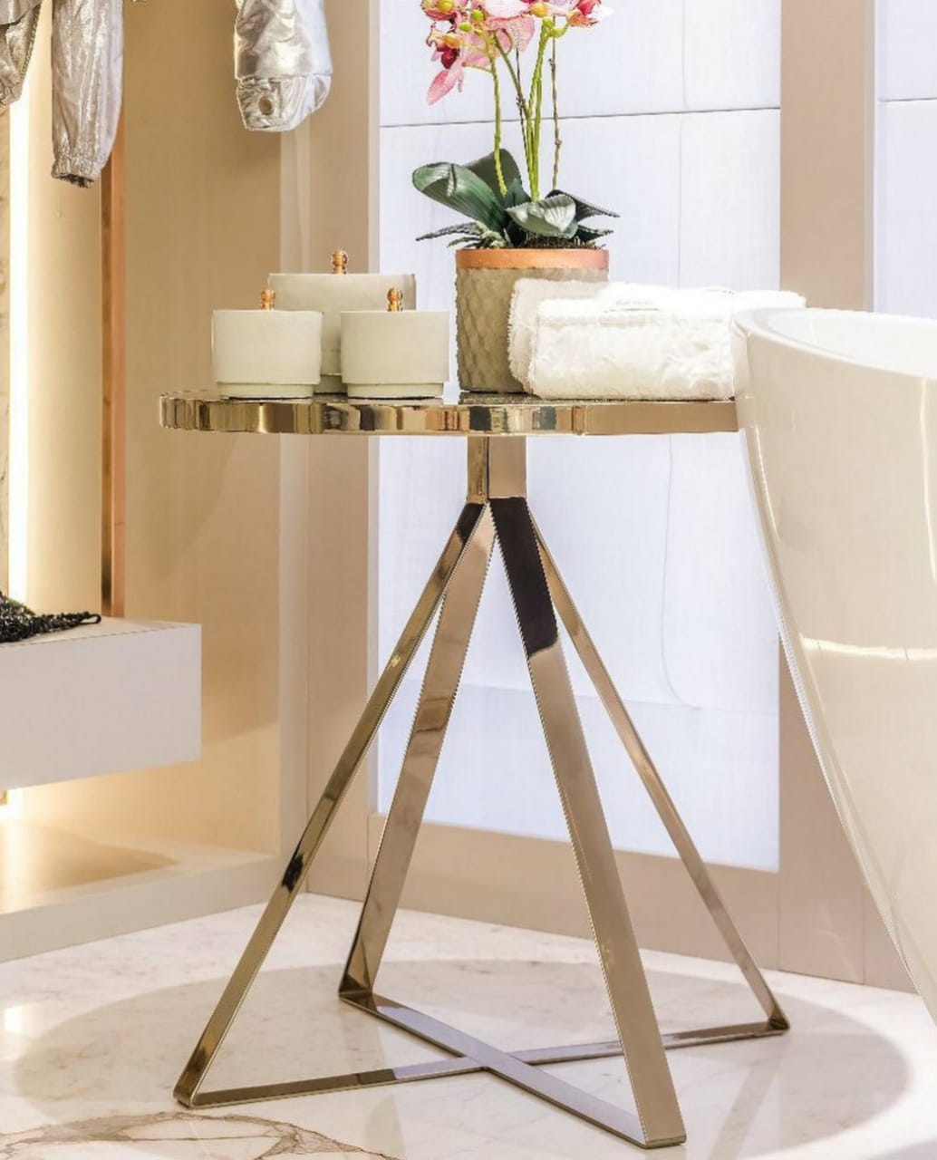 Material: Base e Aro em aço inox tonalizado e tampo em espelho bronze