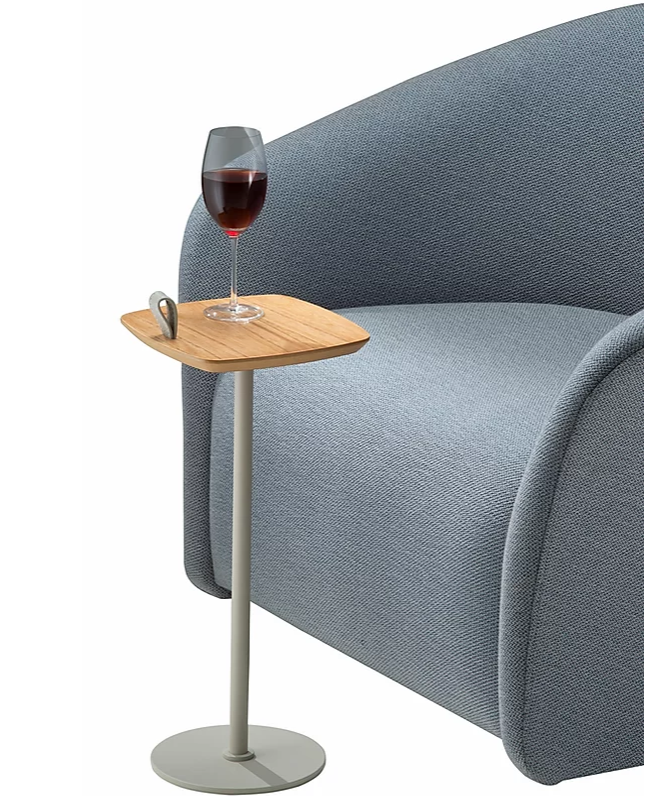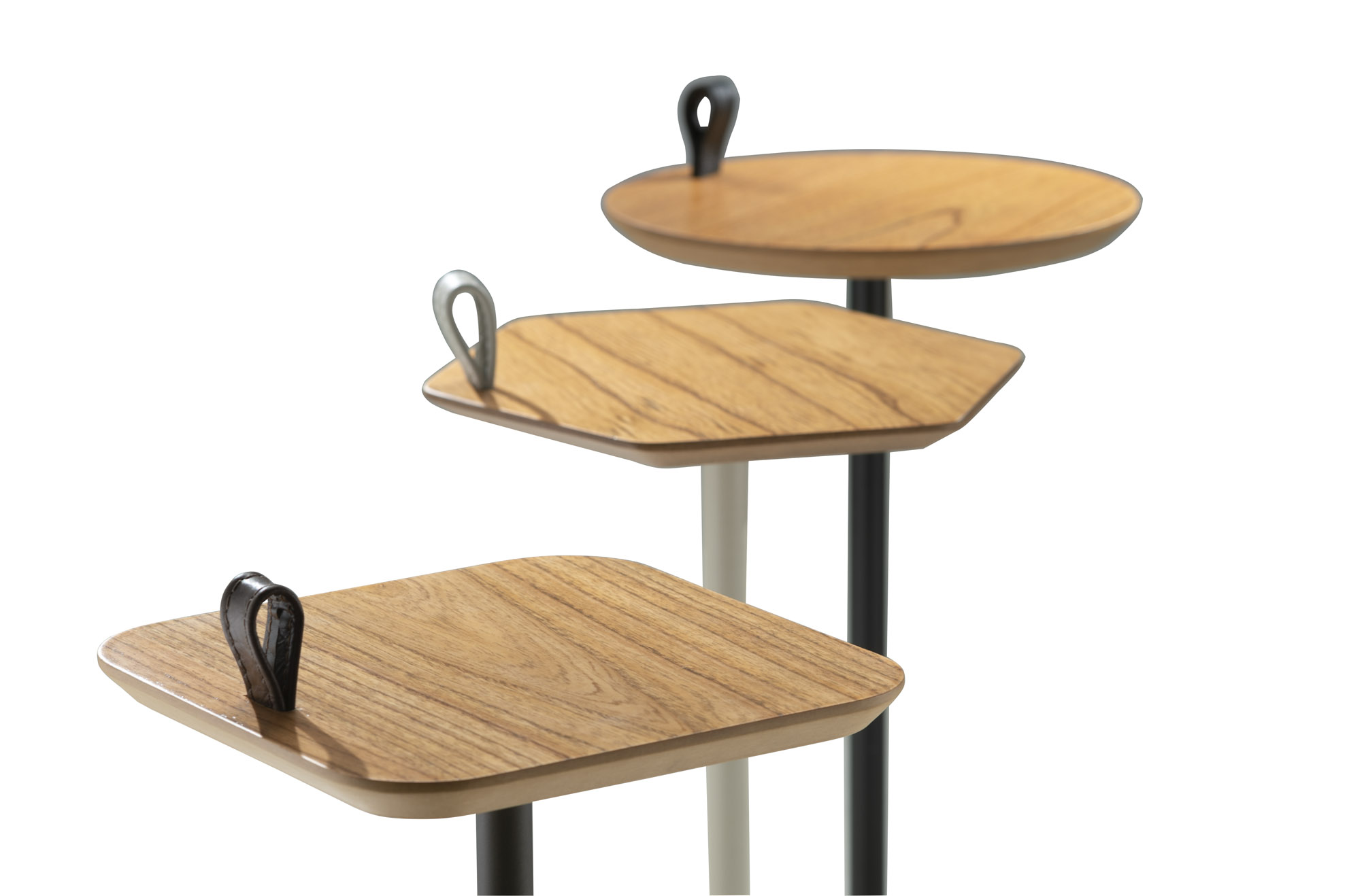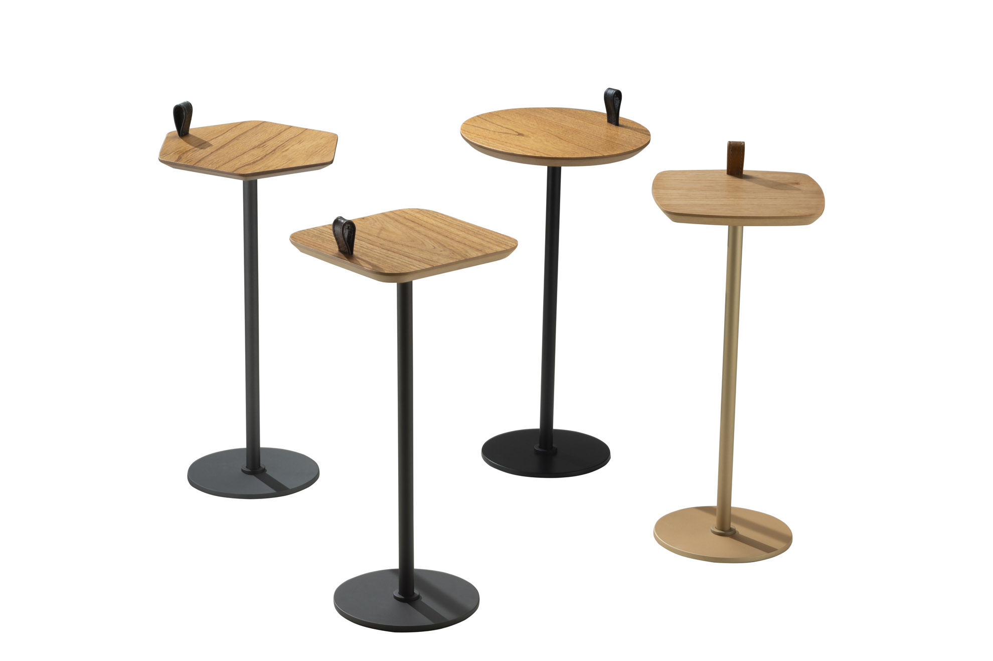 Material: Tampo em madeira laminada com detalhe em couro e base em metal com pintura fosca