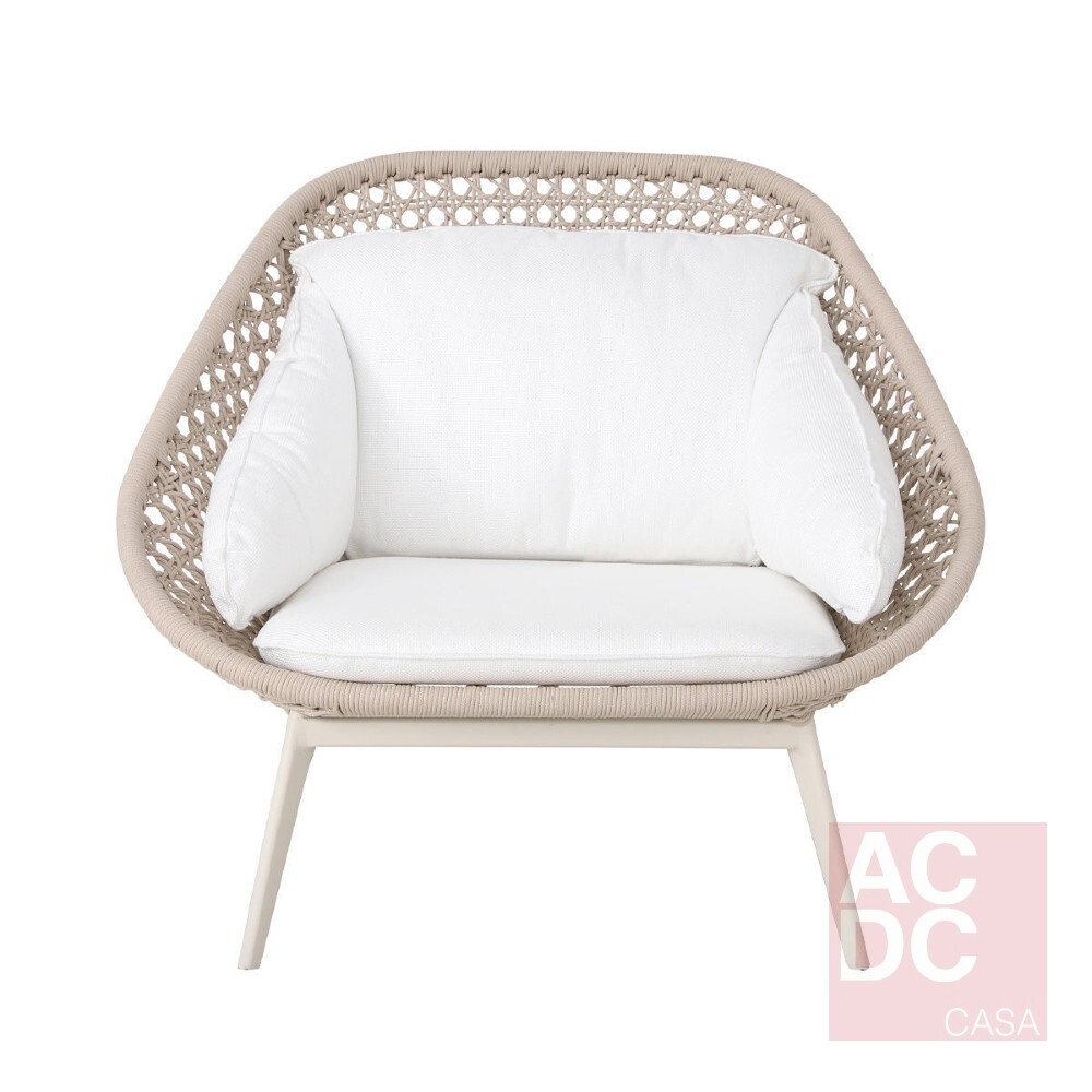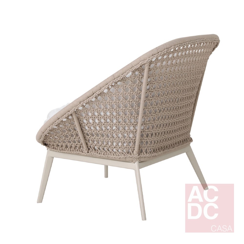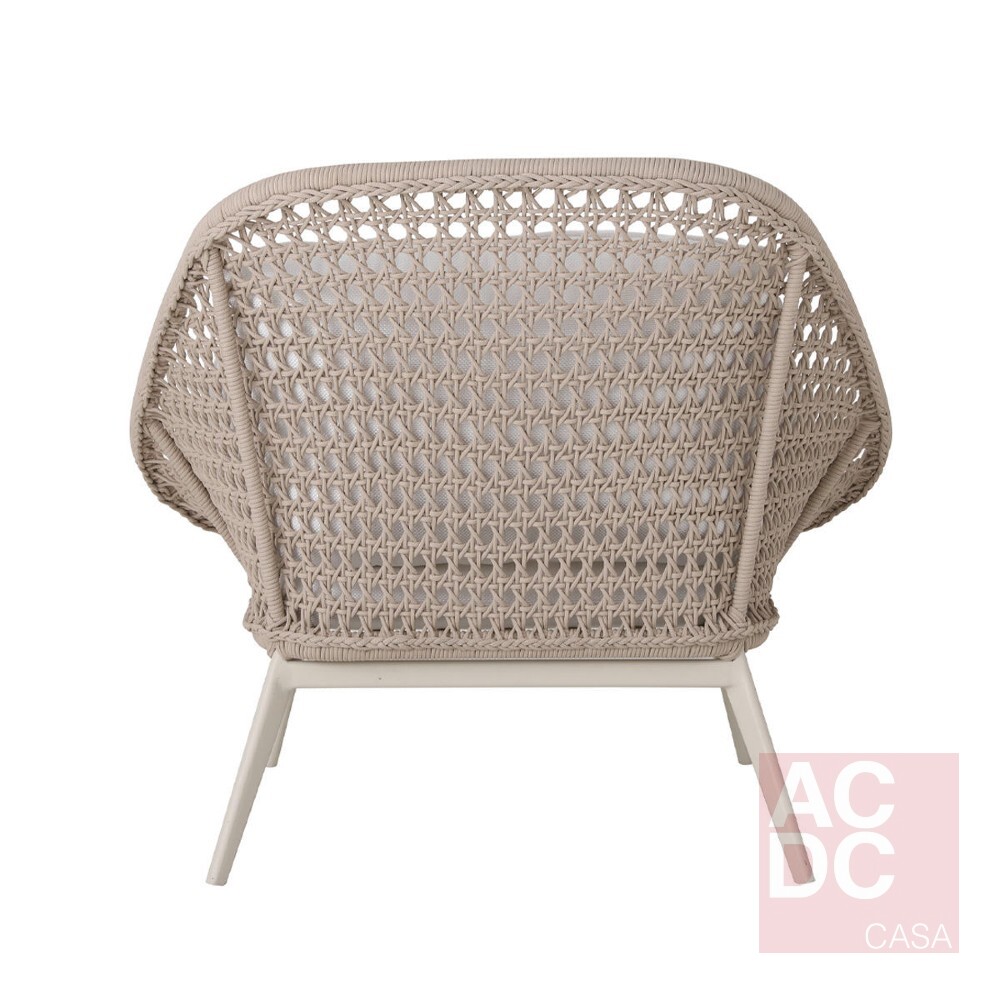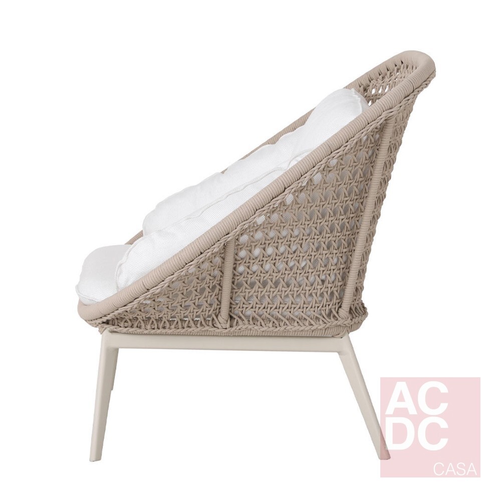 Material: Estrutura em alumínio e acabamento em corda náutica – almofadas estofadas no assento e encosto.