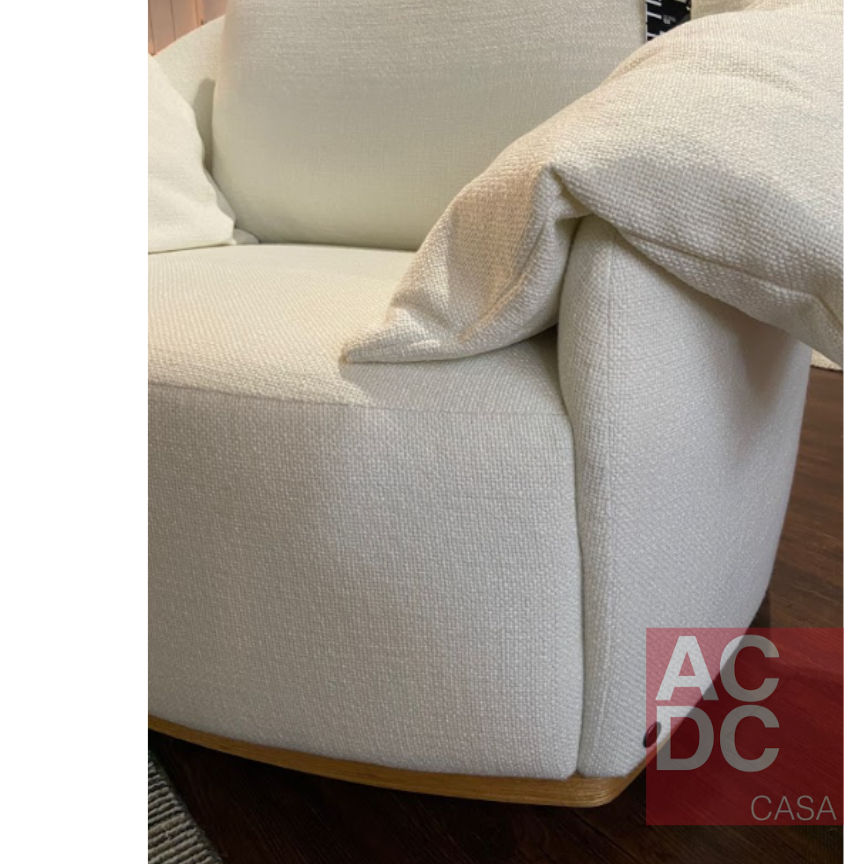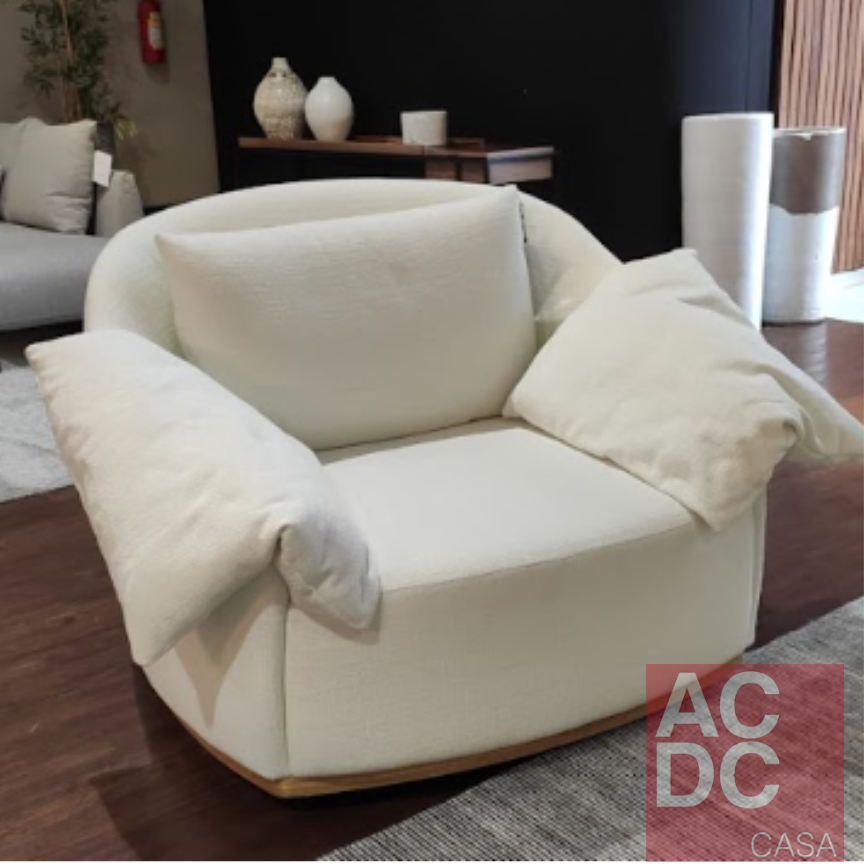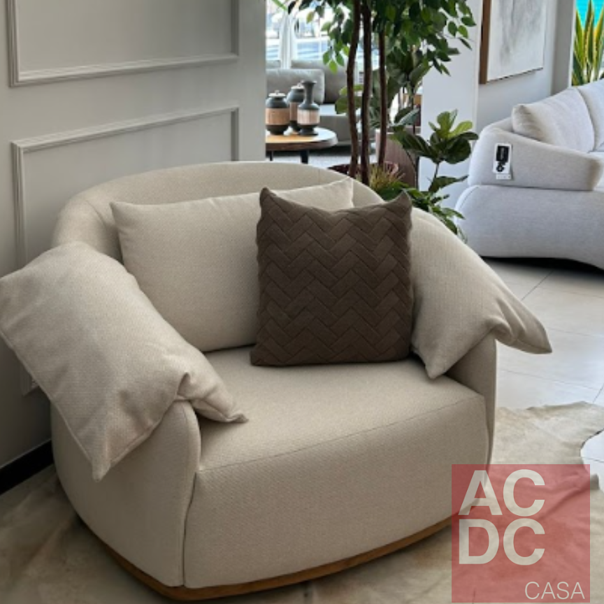 Estrutura em madeira Eucalipto. Assento composto por espuma D28, envolvida por plumante 150, com percintas elásticas trançadas e entrelaçadas. Seu encosto possui plumante 150, percintas elásticas trançadas e entrelaçadas e fibra nas almofadas de encosto e decorativas/braço. Base em MDF revestida com Lâmina Natural, com sistema giratório.