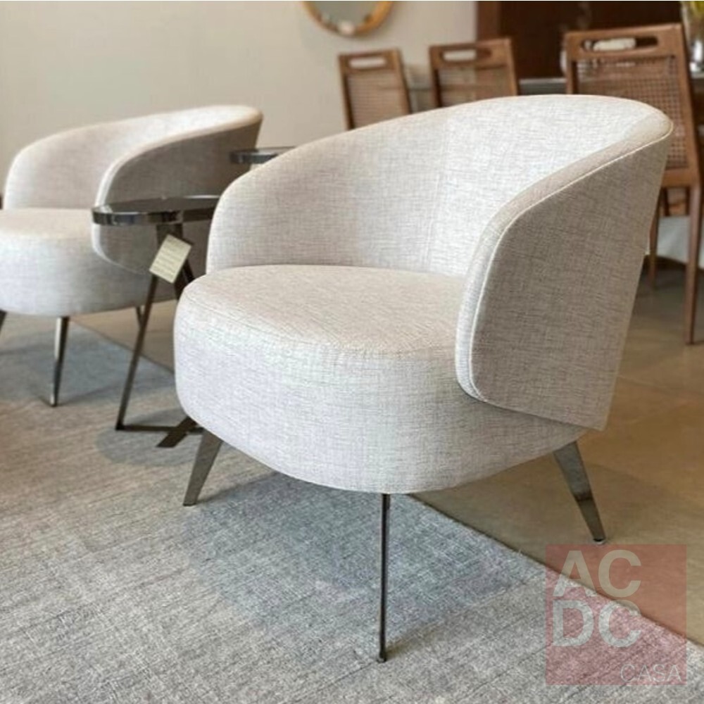 Material: Concha Estofada, com braços, tecido Pu sintético nas costas, tramado na parte interna, pés em aço carbono pintado – com design arredondado.