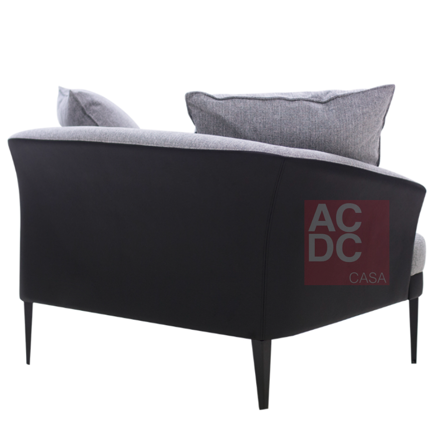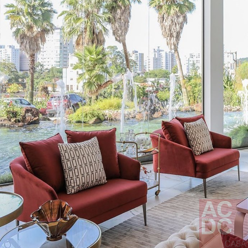 Em fibra de vidro, assento fixo com percintas italianas de alta resistência, almofadas de encosto soltas, pés em aço carbono pintado ou com banho metálico.