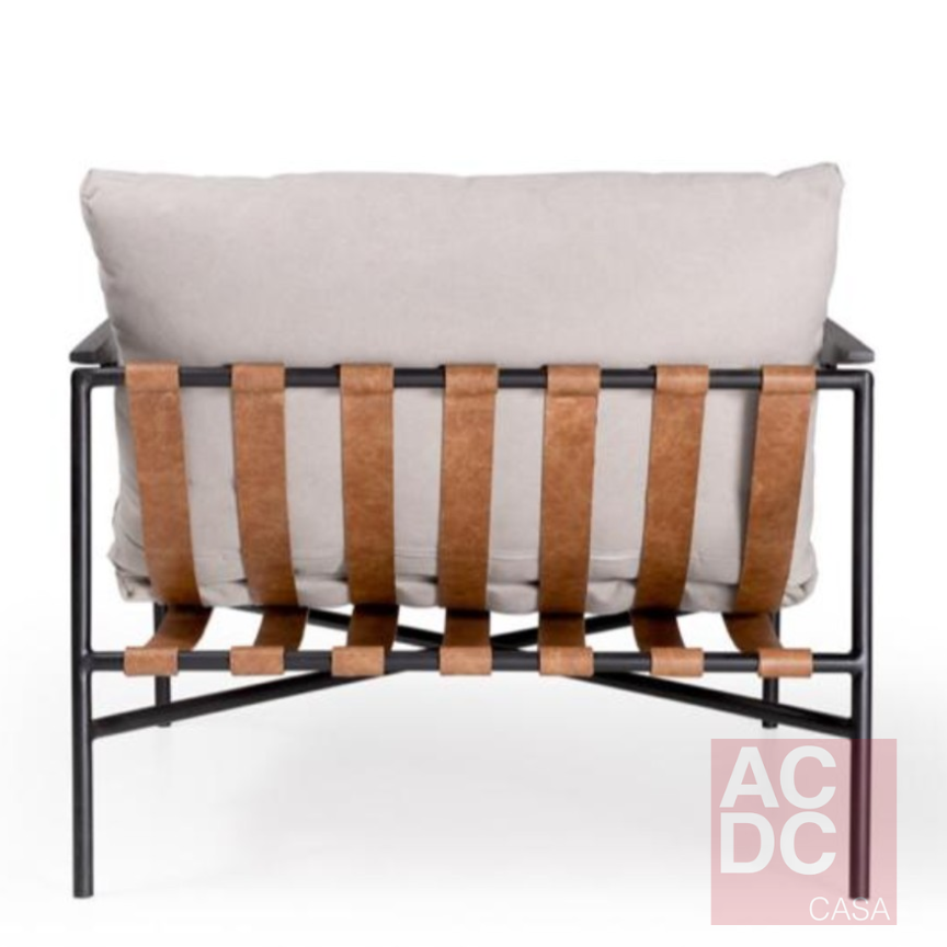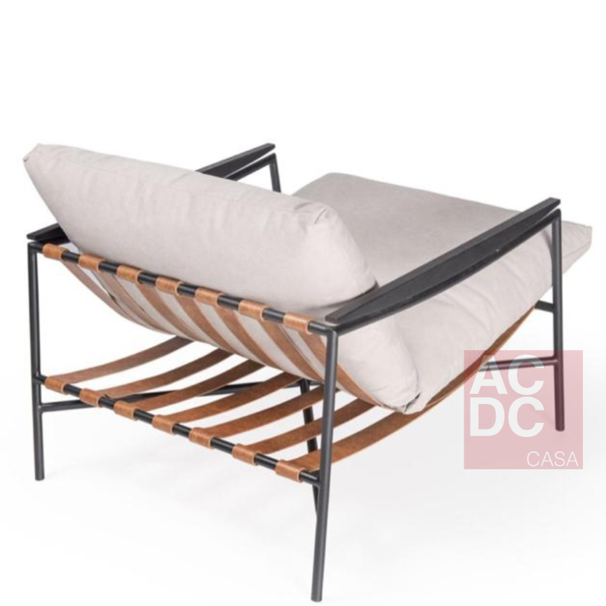 Material: Detalhes nos braços em madeira, estofada em  tecido, tiras em couro e estrutura em aço carbono