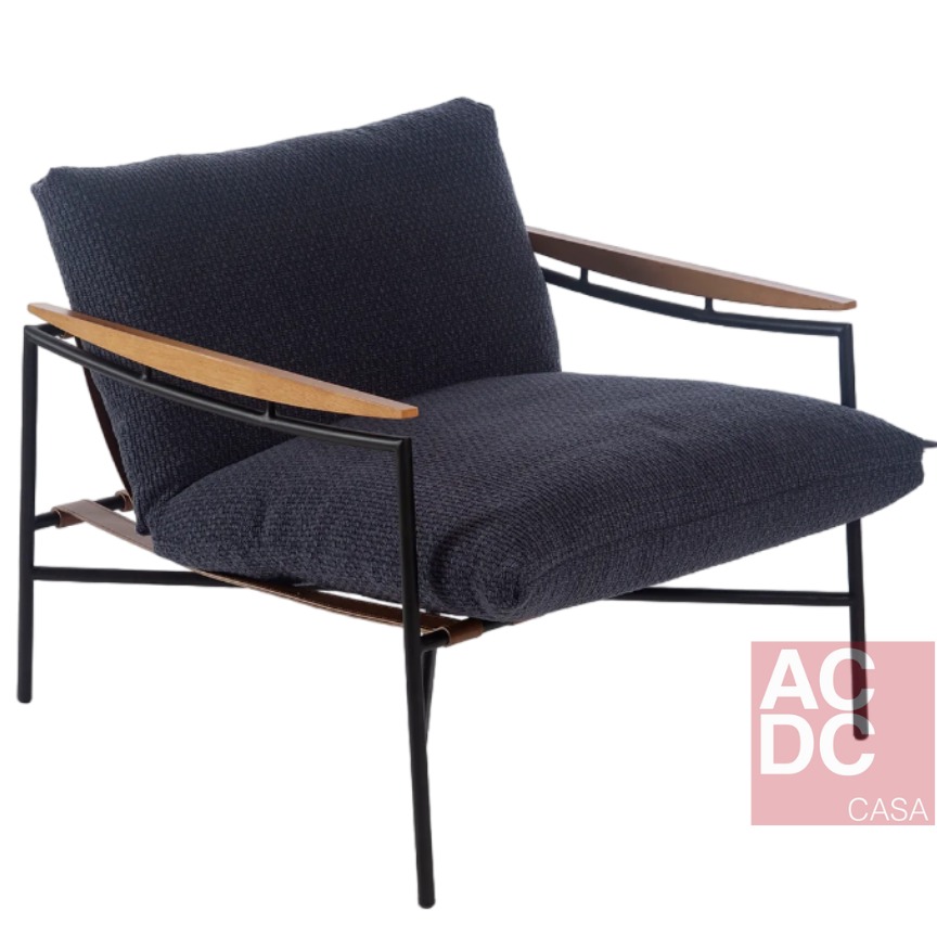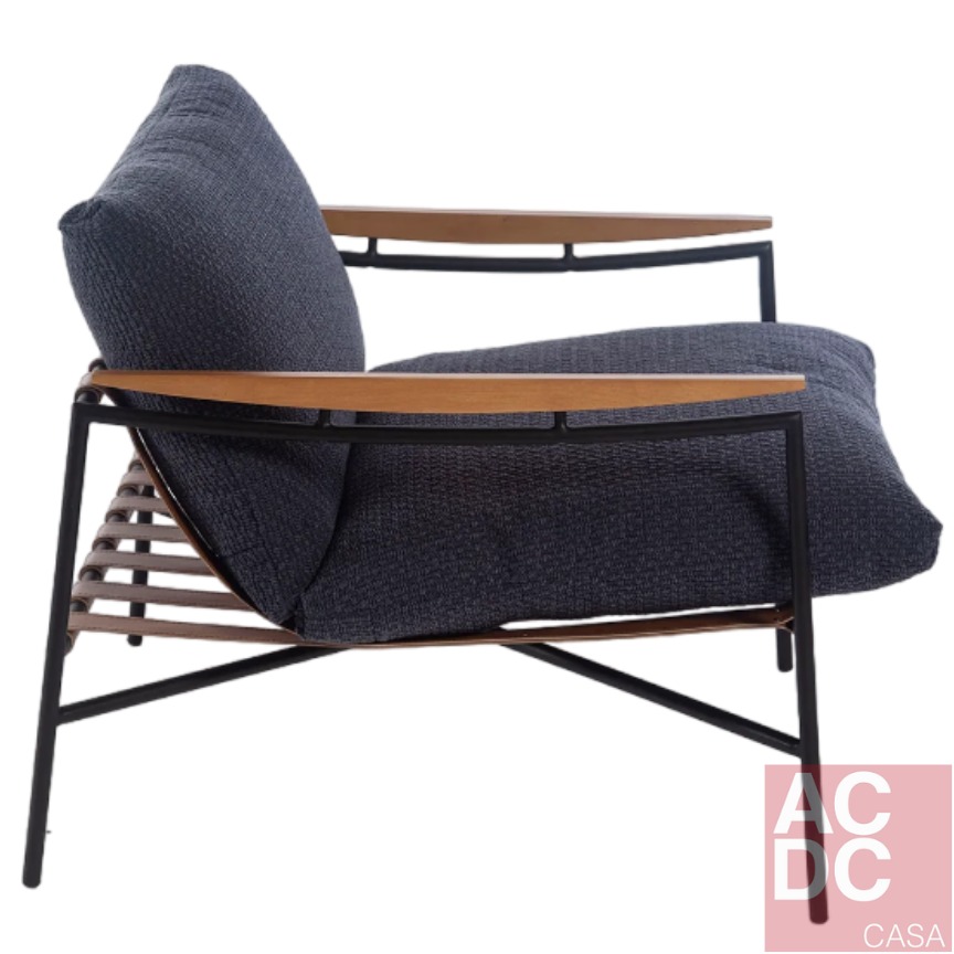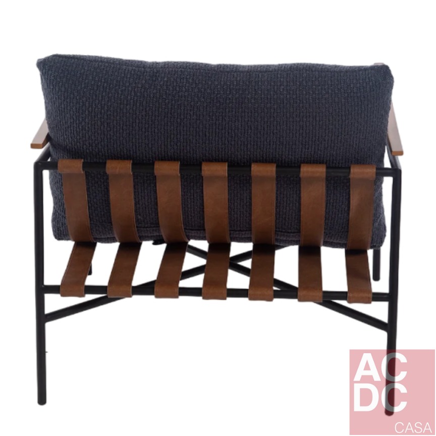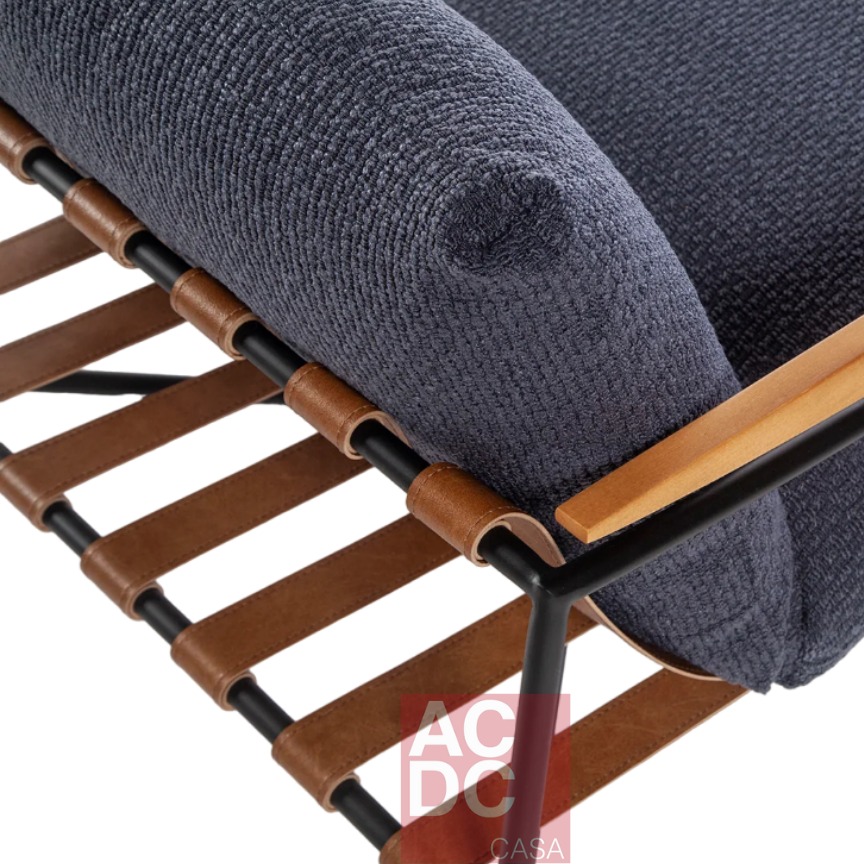 Material: Estrutura em Aço carbono, com tiras em Couro e braços em madeira, estofada em tecido