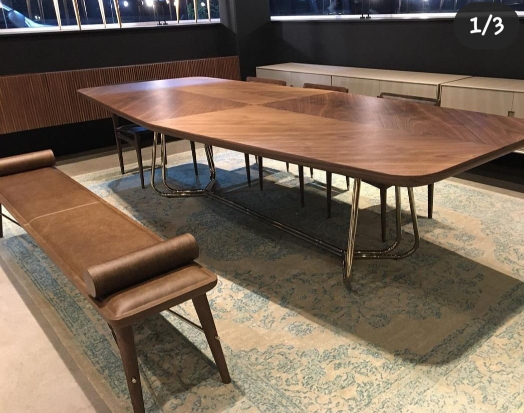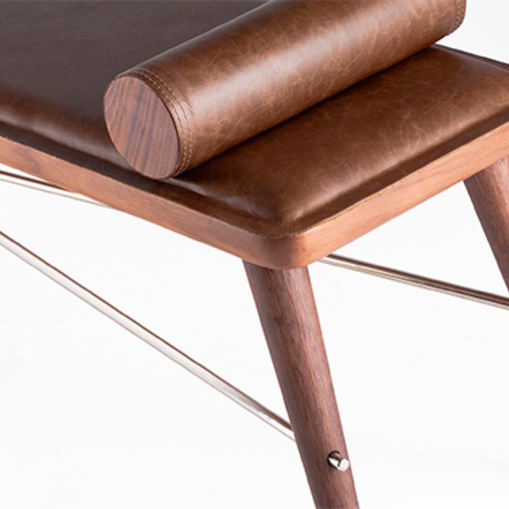 Material: Estrutura em madeira laminada, base com detalhes em inox e estofado em couro com almofadas laterais