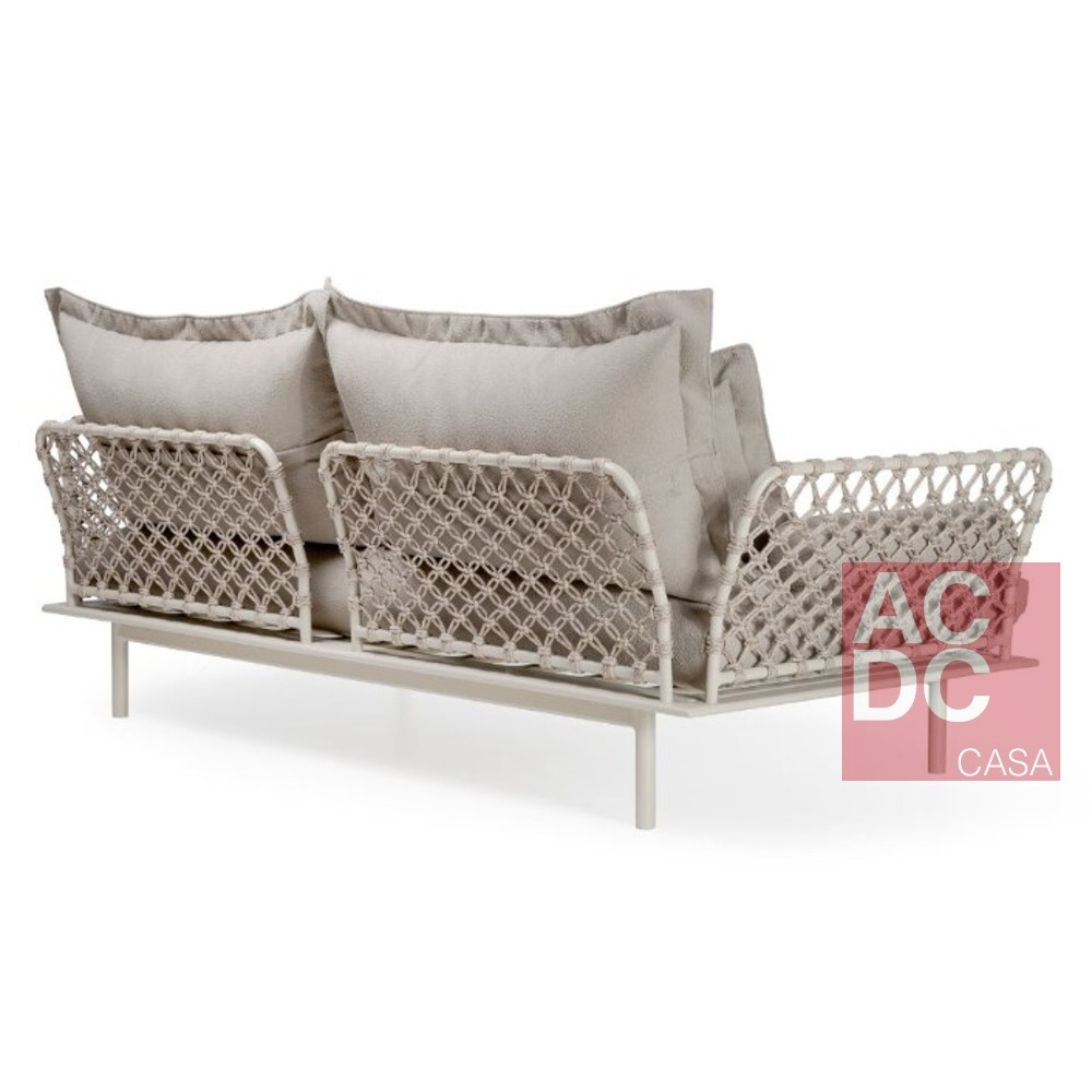 Material: Estrutura em alumínio com pintura eletrostática. Revestimento em tecido e acabamento artesanalmente tramado em corda náutica.  Assento estofado com características sintéticas. Acompanha duas almofadas rineira e duas almofadas de rolinho.