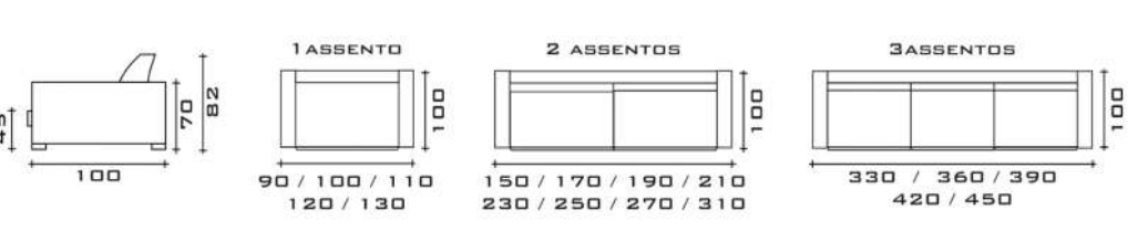 Medida Unitária: Altura: 81 | Largura: 210 | Profundidade: 100 cm | Braços: 15 cm com 2 assentos