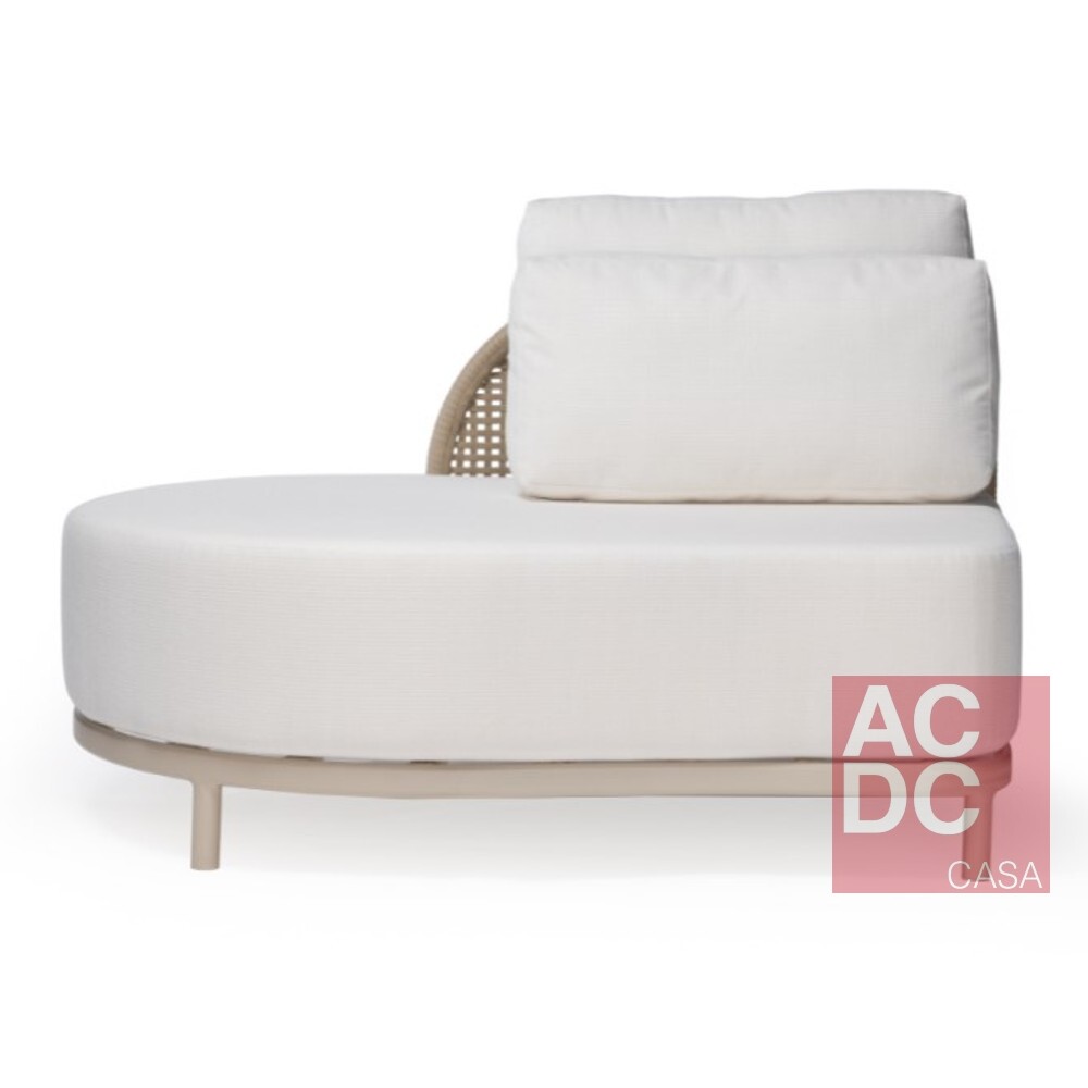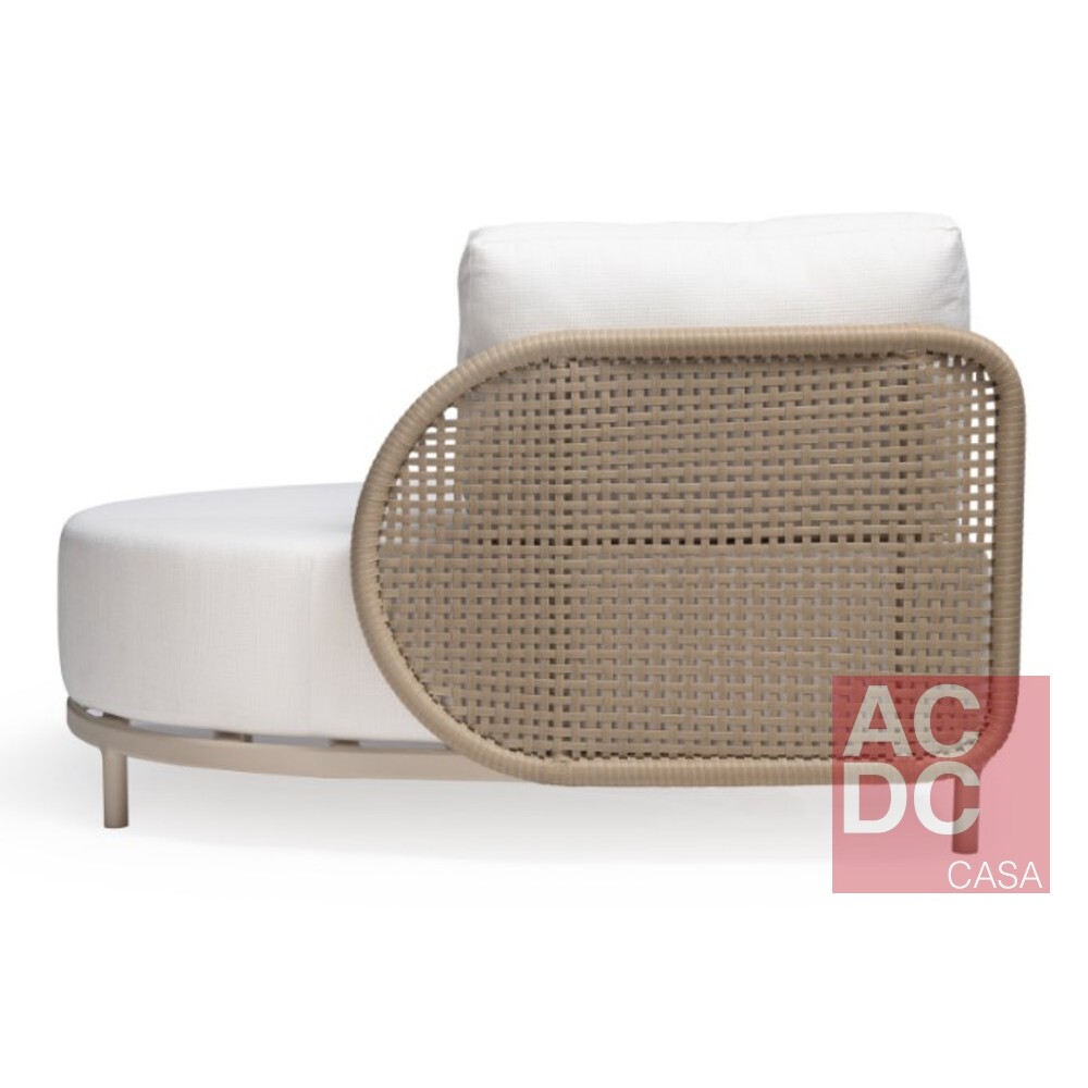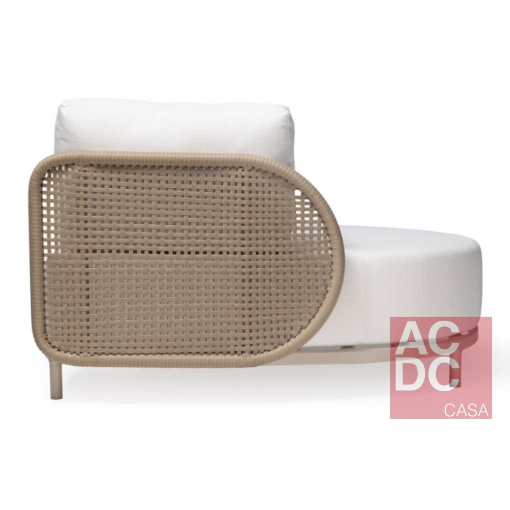 Material: Estrutura em alumínio com acabamento artesanalmente tramado em fibra sintética. Assento estofado com espuma D28 macia e manta acrílica. Revestimento em tecido próprio para área externa. Acompanha uma almofada decorativa estofada em fibra siliconizada por módulo.