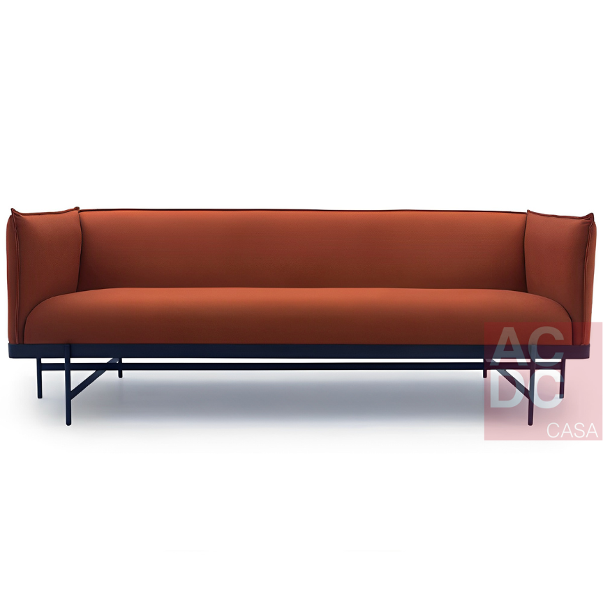 Sofá de 174 cm design contemporâneo, com linhas retas, assento e encosto fixo com tecido nos tons terracota. Estrutura metálica em epóxi na cor preto. A Coleção Linhas é composta por sofá, poltrona, pufe e banco. As peças são valorizadas pela marcante estrutura metálica aparente que envolve o estofado. A separação dos elementos destaca o aspecto moderno e funcional do produto. A estrutura racional não oferece elementos supérfluos. O volume do enchimento contrasta com a leveza da base que, como palafitas suspensas no chão, parece desafiar a gravidade. Os braços intencionalmente mais altos proporcionam proteção e intimidade ao sentar e, ao mesmo tempo, uma postura imponente.