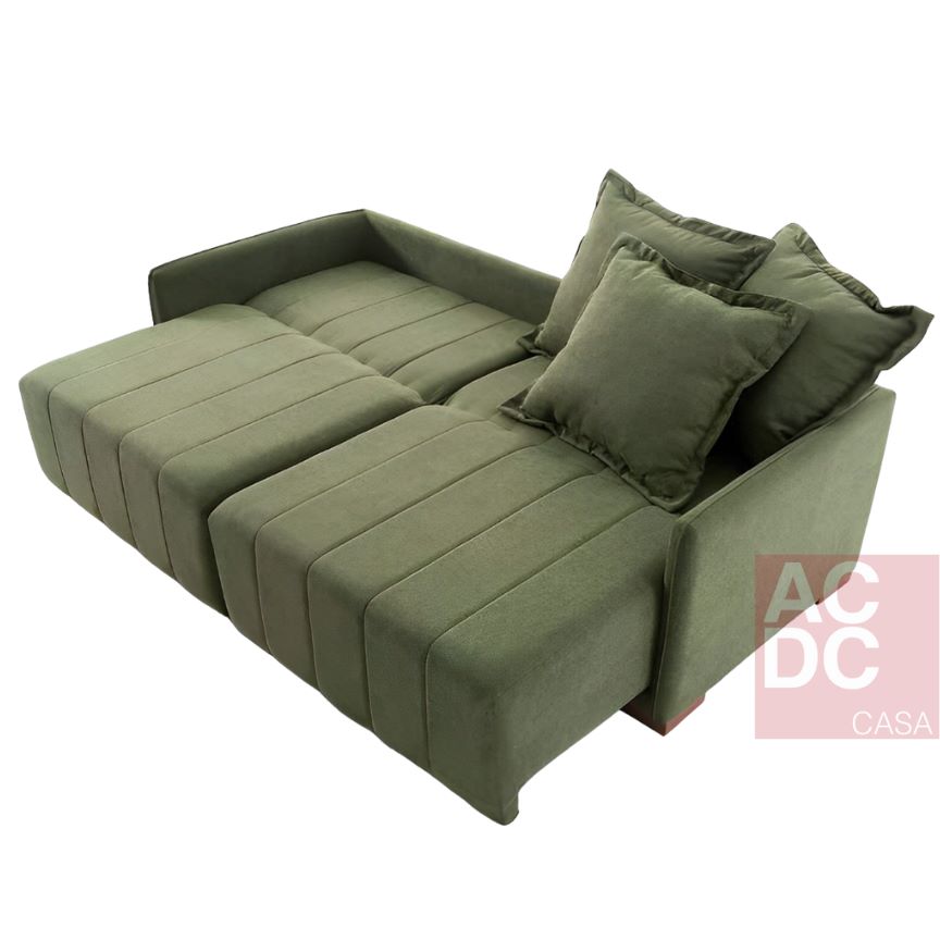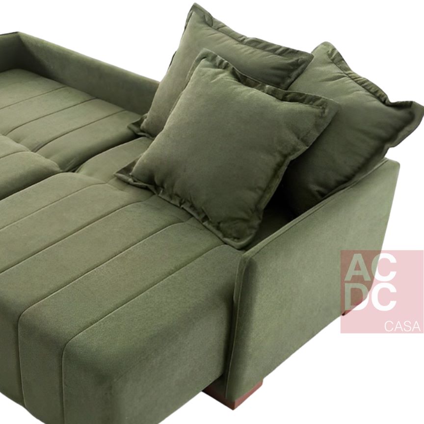 Material: Espuma D28 soft, percintas elásticas e molas Bonnel , estofado fixo no assento e soltos no encosto – Retrátil